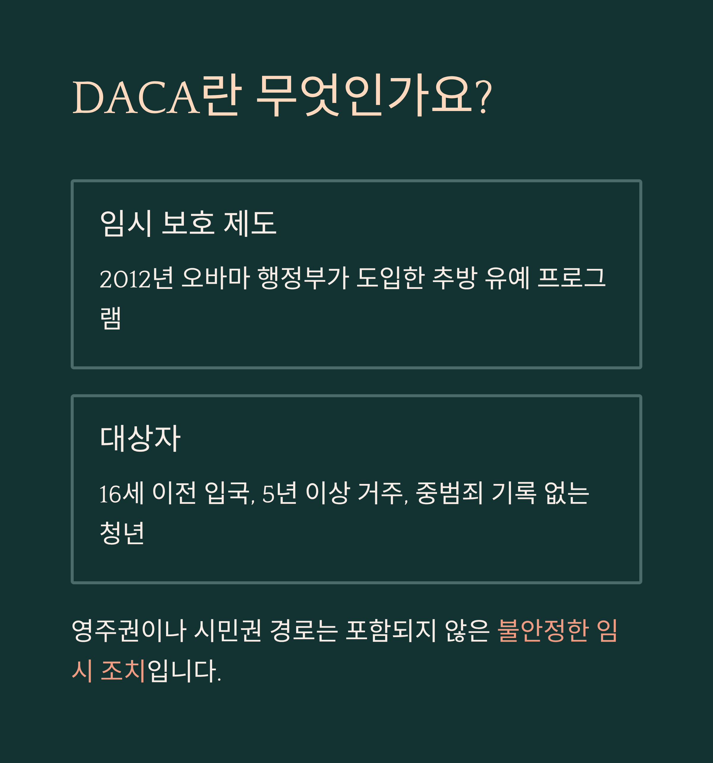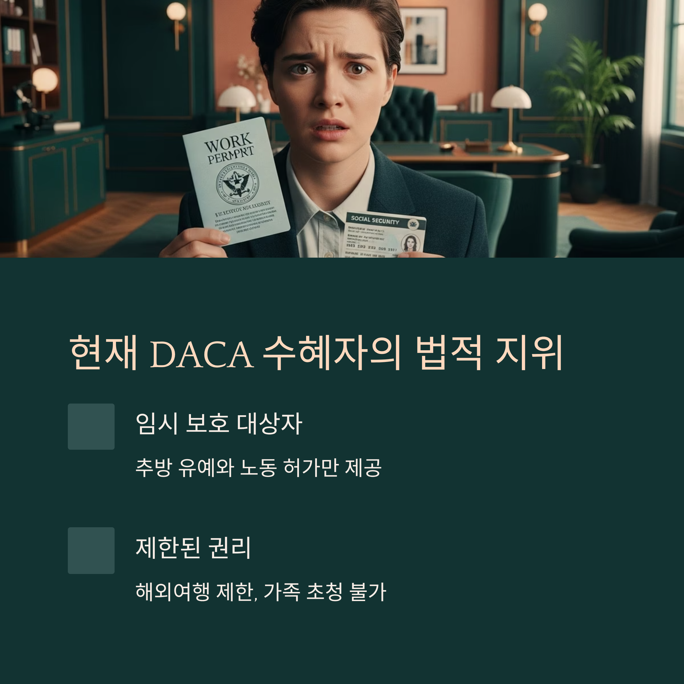 DACA는 2012년에 처음 도입된 프로그램으로, 어린 시절 부모와 함께 불법 체류 신분으로 미국에 입국한 사람들에게 한시적인 보호를 제공하는 제도예요. DACA 수혜자는 추방 유예와 함께 노동 허가를 받을 수 있지만, 이 신분만으로는 영주권을 신청할 수 없다는 한계가 있었죠.