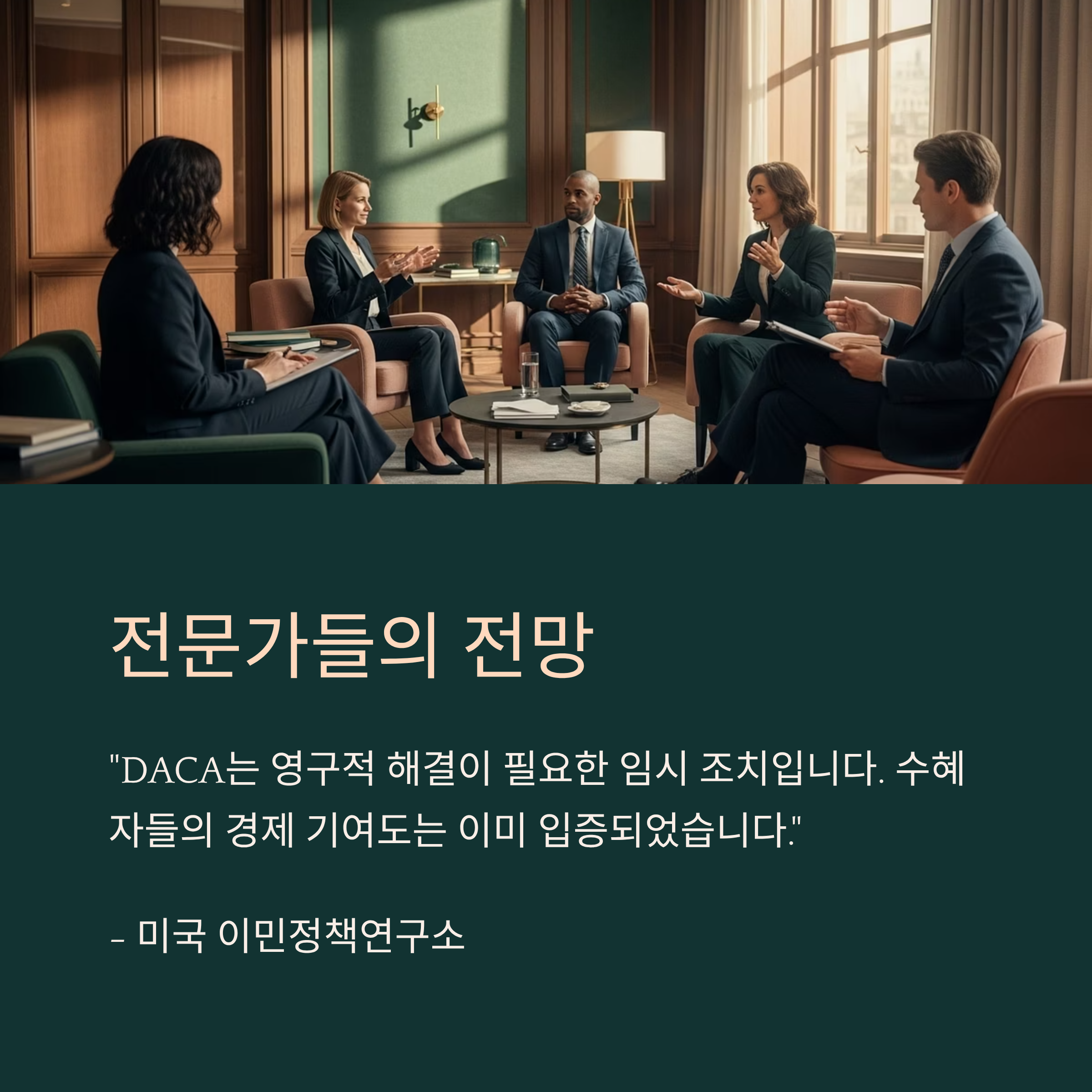 이민 전문 변호사들과 정책 분석가들은 공통적으로 "DACA는 영구적인 해결이 필요한 임시 조치"라고 강조해요. 그동안 10년 이상 임시 신분으로 살아온 이들에게 더 이상 기다리게 하는 건 비인도적이라는 의견도 많답니다.