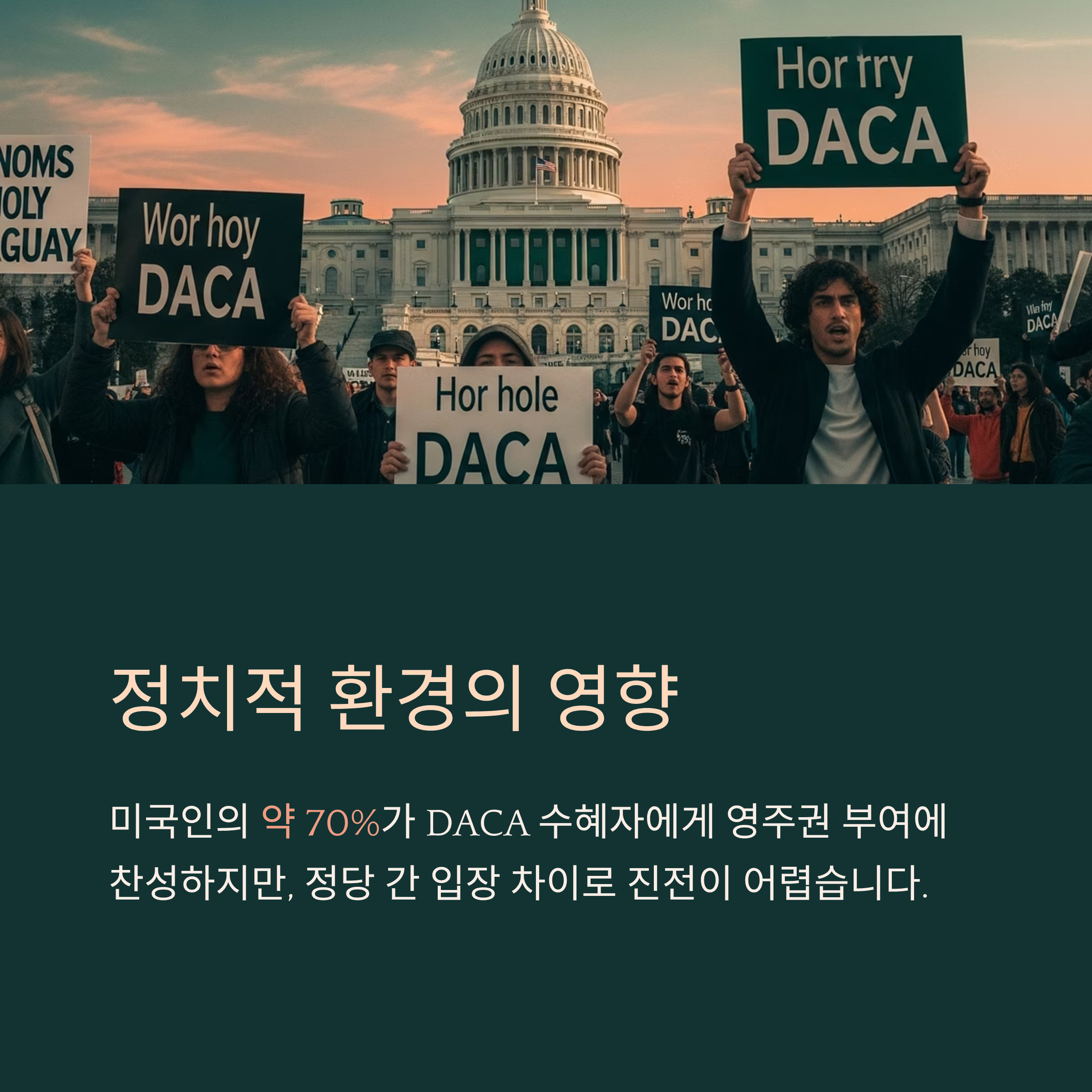 2025년 현재는 DACA 수혜자에게 특례 영주권을 제공하는 새로운 초당적 법안이 논의되고 있지만, 미국 대선을 앞둔 정치적 분위기 때문에 확실한 진전을 이루기는 어렵다는 평가가 많아요. 특히 선거 국면에서는 이민 이슈가 정쟁의 도구로 사용되기 쉽기 때문이에요.