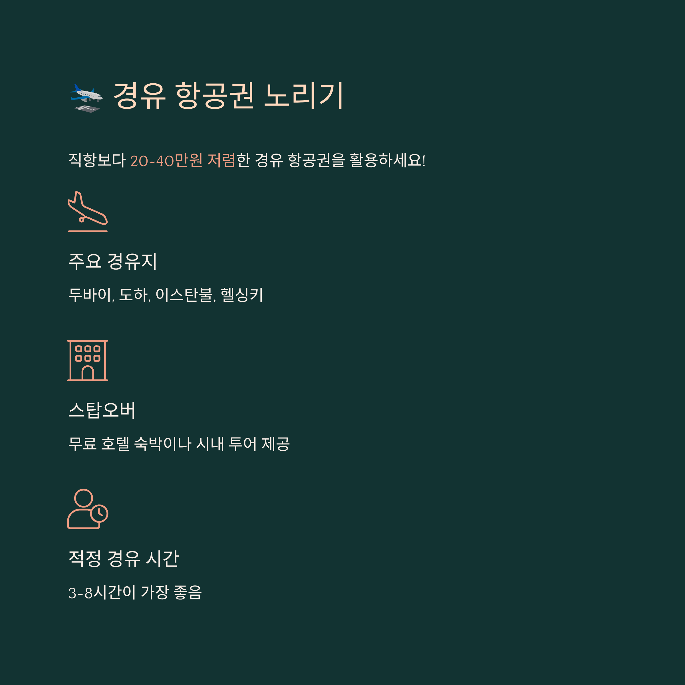 직항 항공권은 빠르고 편하지만, 가격은 비쌀 확률이 높아요. 특히 유럽행 노선에서는 직항보다 경유 항공권이 평균적으로 20~40만 원 이상 저렴한 경우가 많답니다. 시간 여유가 있다면 경유 노선을 눈여겨보는 것도 현명한 선택이에요.