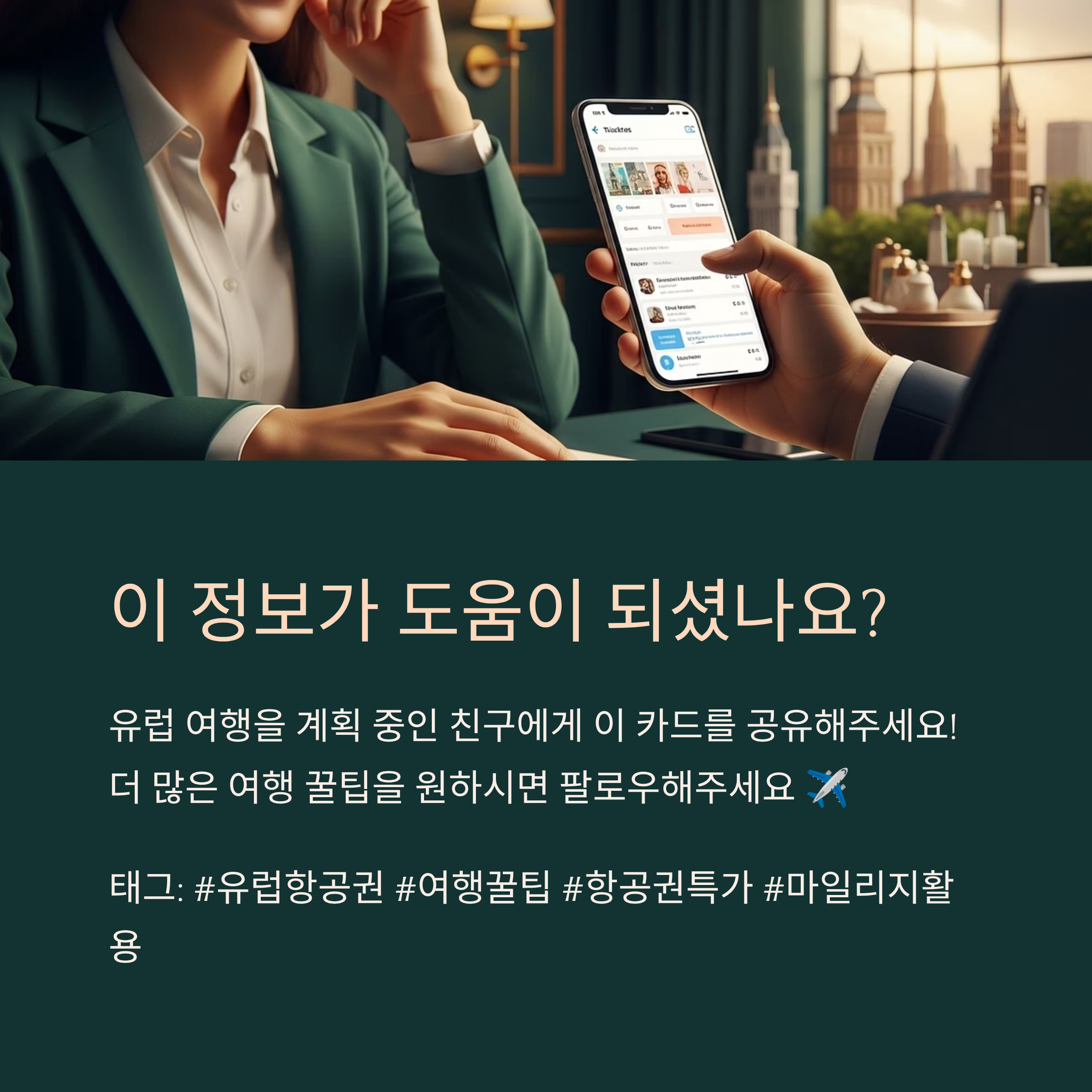 마일리지는 단기전보다 장기전이 유리해요. 일상 속 소비를 통해 차곡차곡 모아두면 언젠가 유럽 항공권이 '무료'가 되는 순간이 오게 되니까요. 카드 혜택도 꼭 활용해서 여행 전부터 이득 보는 습관, 지금부터 시작해 보세요 💼