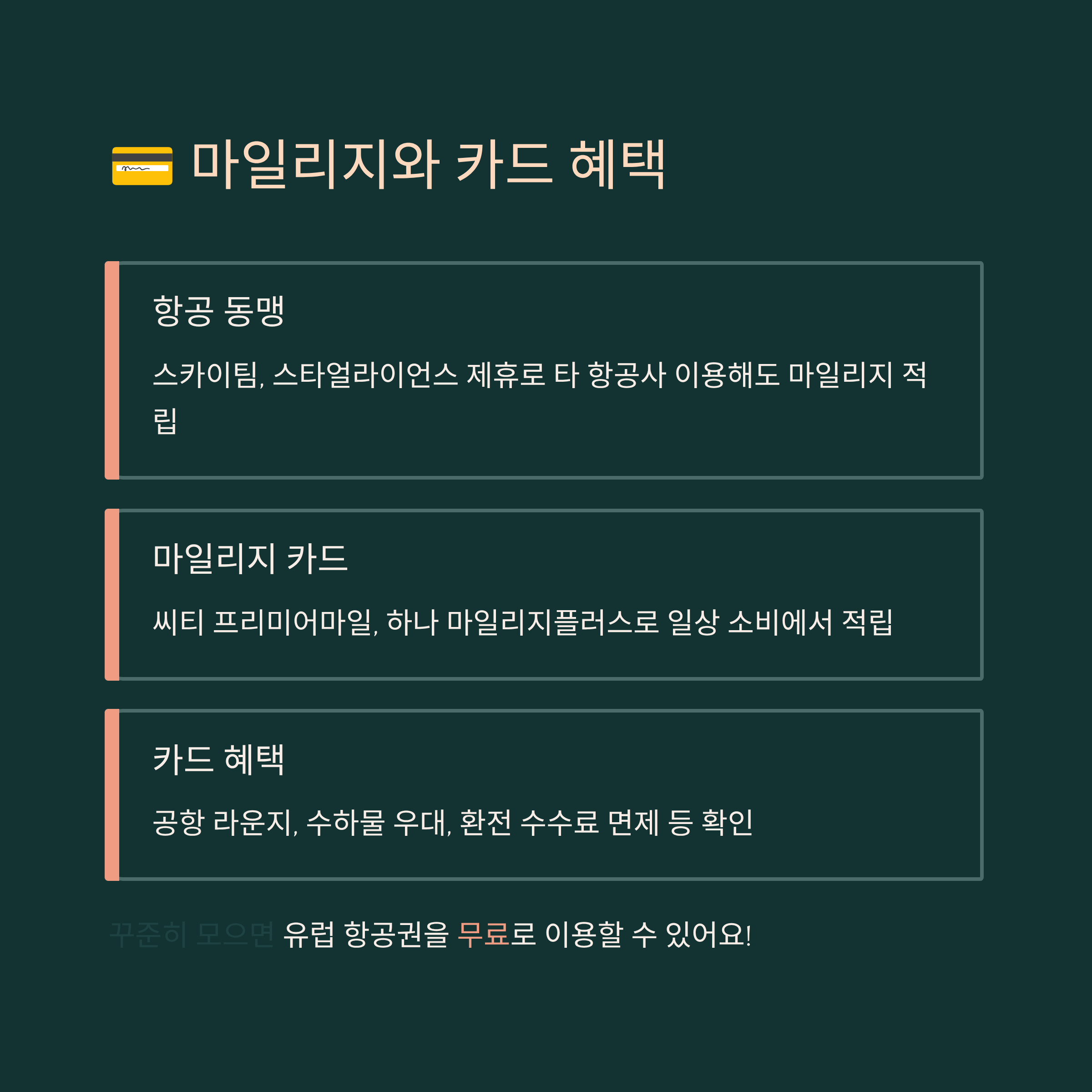 항공권을 싸게 사는 방법 중에 ‘마일리지’만큼 무시할 수 없는 게 없어요. 정립해 두기만 하면 어느 날 유럽 왕복 항공권을 거의 ‘0원’에 탈 수도 있답니다. 특히 꾸준히 항공을 이용하거나, 마일리지 적립 가능한 신용카드를 쓰는 분들이라면 더 주목할 만한 전략이에요.