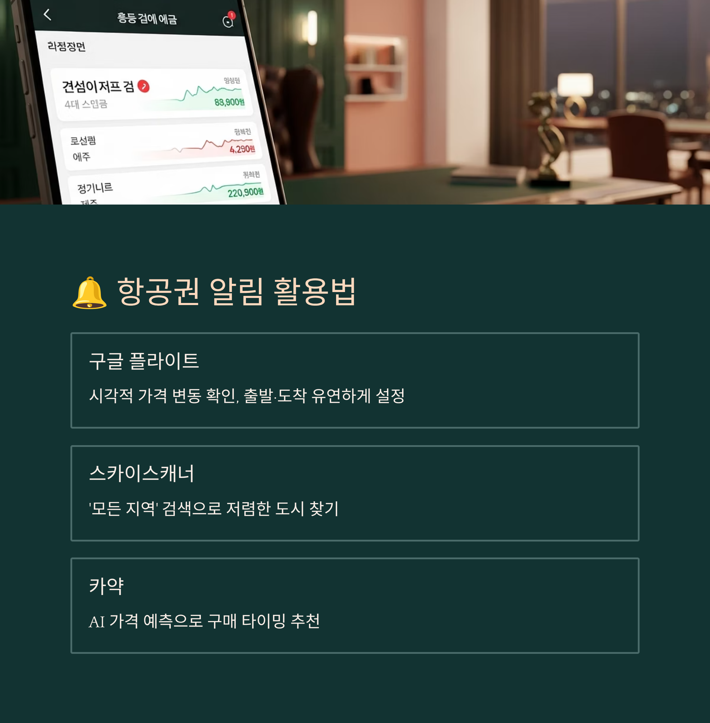 | 구글 플라이트 | 직관적인 가격 비교 및 알림 | 출발·도착 유연하게 설정 |