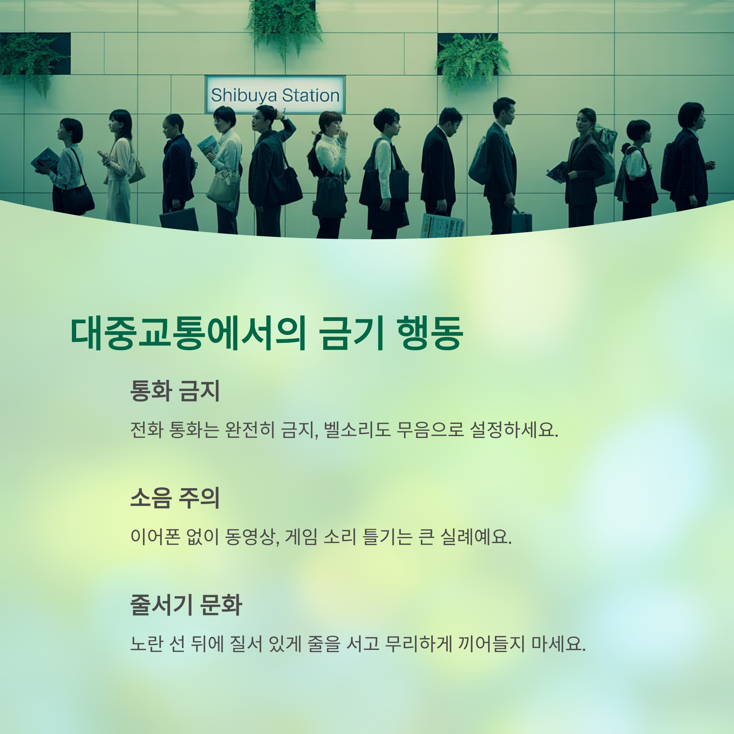 일본의 대중교통은 전 세계적으로 유명한 정숙 문화가 있어요. 지하철, 버스, 기차 등 어디서든 조용히 이동하는 게 기본이에요. 특히 통화는 완전히 금지된다고 생각하는 게 좋아요. 벨소리도 무음으로 설정하는 것이 예의랍니다.