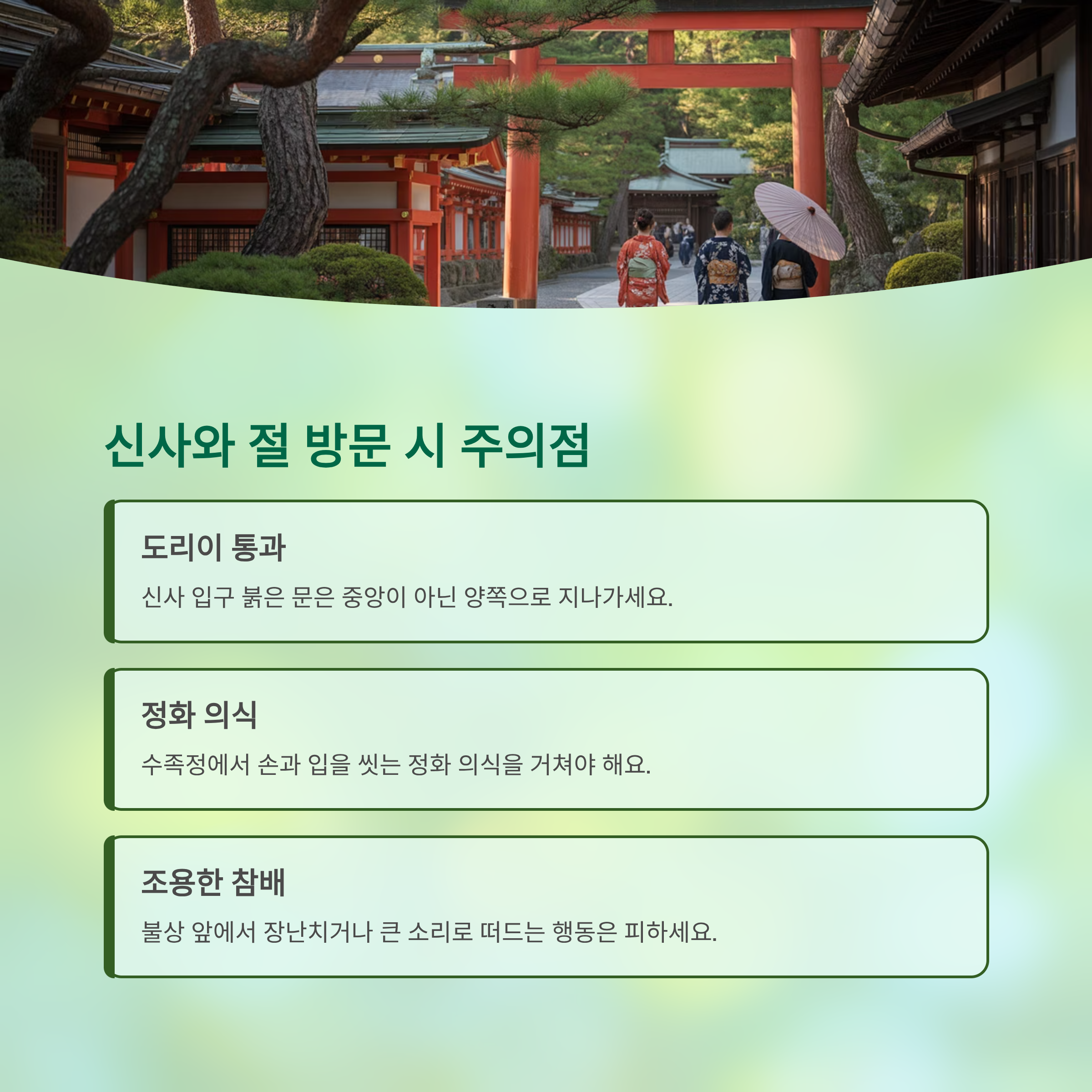 절에서는 탑이나 불상 앞에서 장난치거나 큰 소리로 떠드는 행동은 피해야 해요. 사진 촬영이 금지된 구역도 많기 때문에 반드시 표지판을 확인해야 해요. 또 절이나 신사에서 기도를 할 때는 방해가 되지 않도록 조용히 움직여야 한답니다.