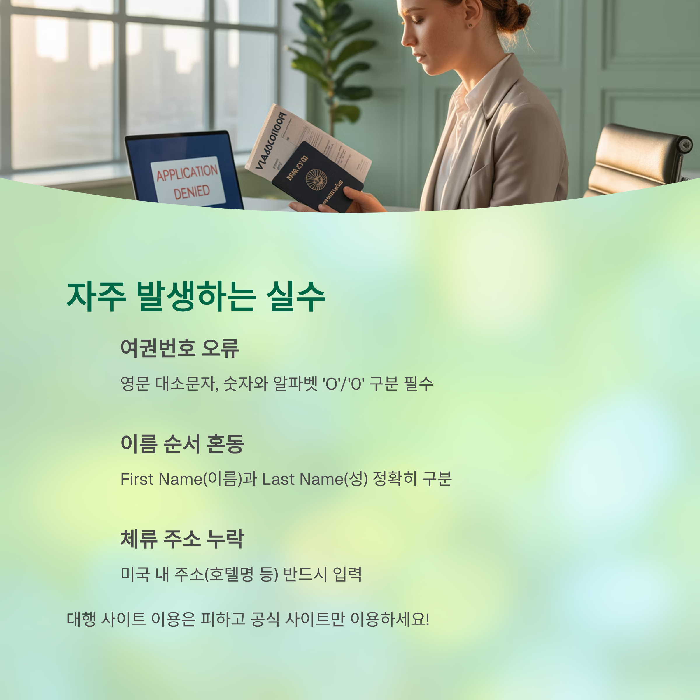 많은 사람들이 ESTA 신청에서 반복적으로 하는 실수들이 있어요. 첫 번째는 여권번호 입력 오류! 영문 대소문자 구분은 물론, 숫자와 알파벳 'O'/'0'을 헷갈리는 경우가 아주 많아요.