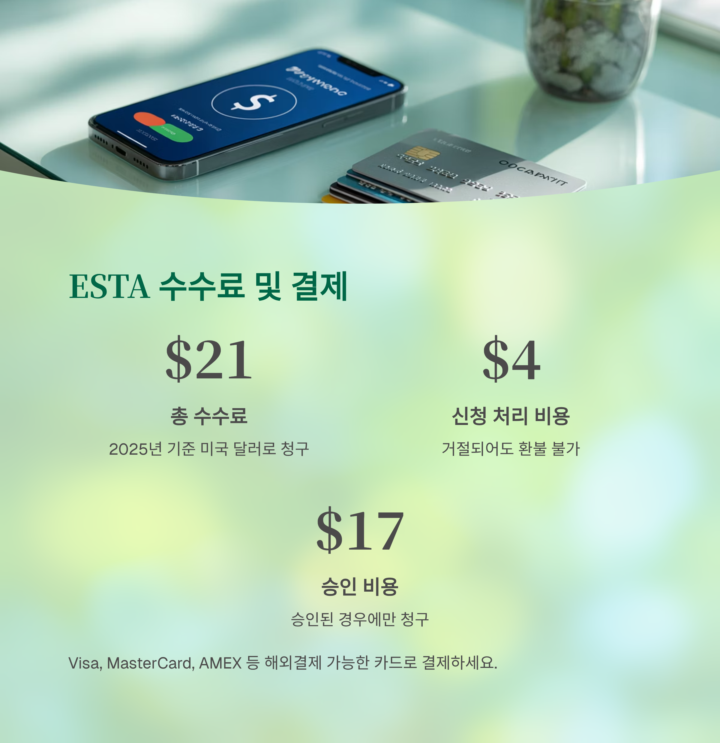 ESTA 신청에는 수수료가 발생해요. 2025년 현재 기준으로 총 $21(미국 달러)가 청구되며, 이 금액은 신청 단계에서 신용카드나 체크카드로 결제할 수 있어요.