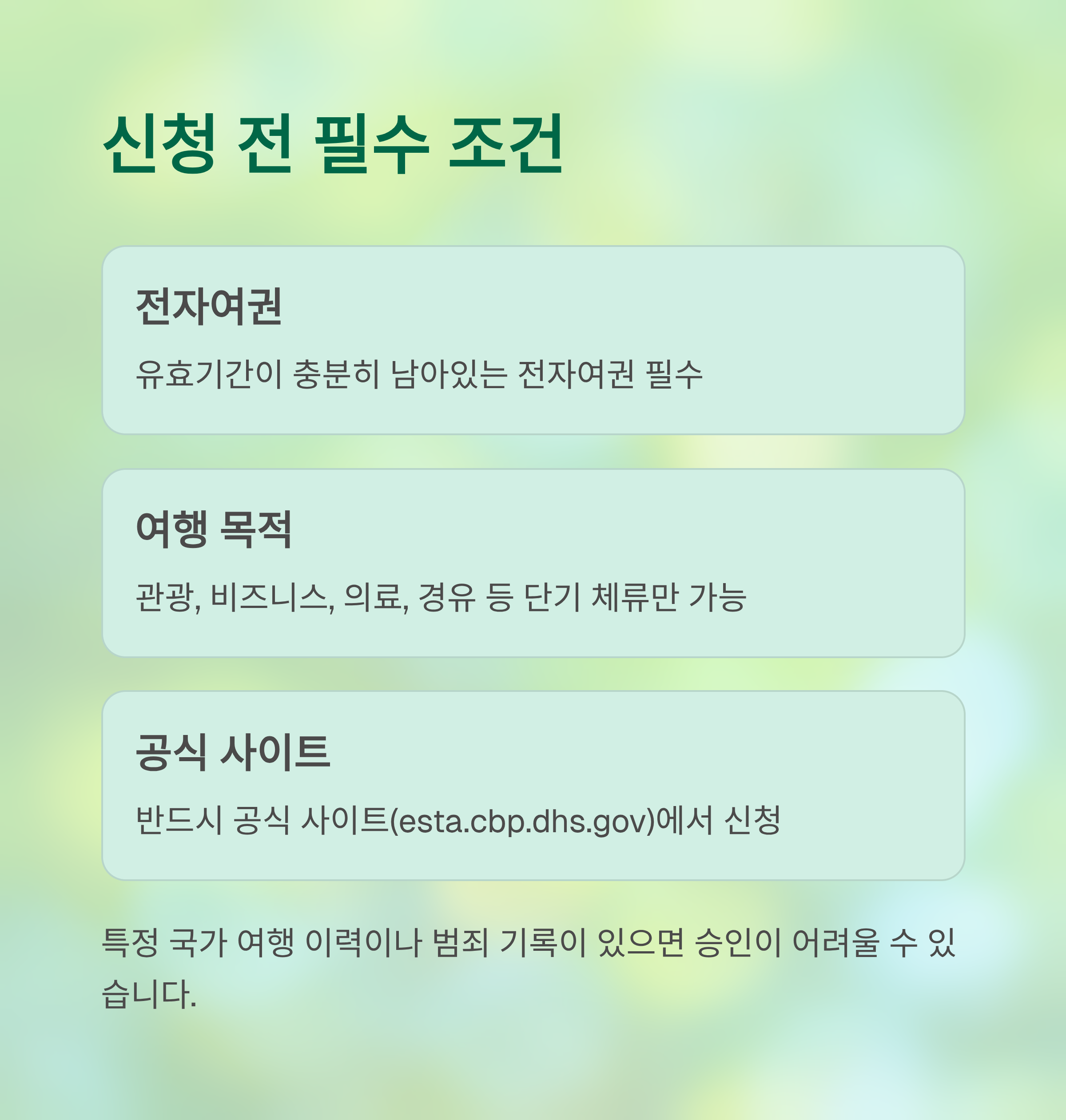 ESTA를 신청하기 위해선 몇 가지 기본 요건을 충족해야 해요. 첫 번째는 여권! 반드시 **전자여권**(e-passport)이어야 하며, 유효기간이 여행 종료일 기준으로도 충분히 남아 있어야 해요.