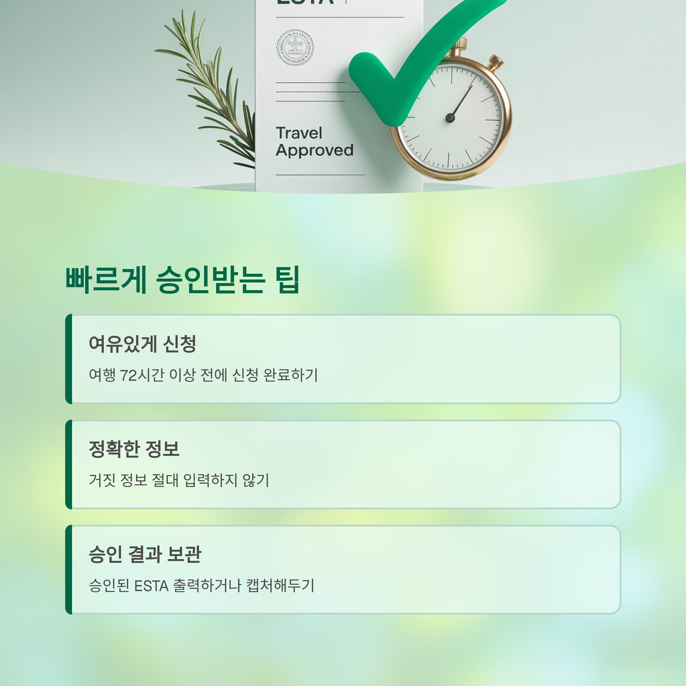 ESTA 승인을 빠르게 받고 싶다면, 몇 가지 포인트만 기억하면 돼요. 첫 번째는 여행 일정 72시간 이상 전에 신청을 완료하는 것! 입국 하루 전이라면 리스크가 크답니다.