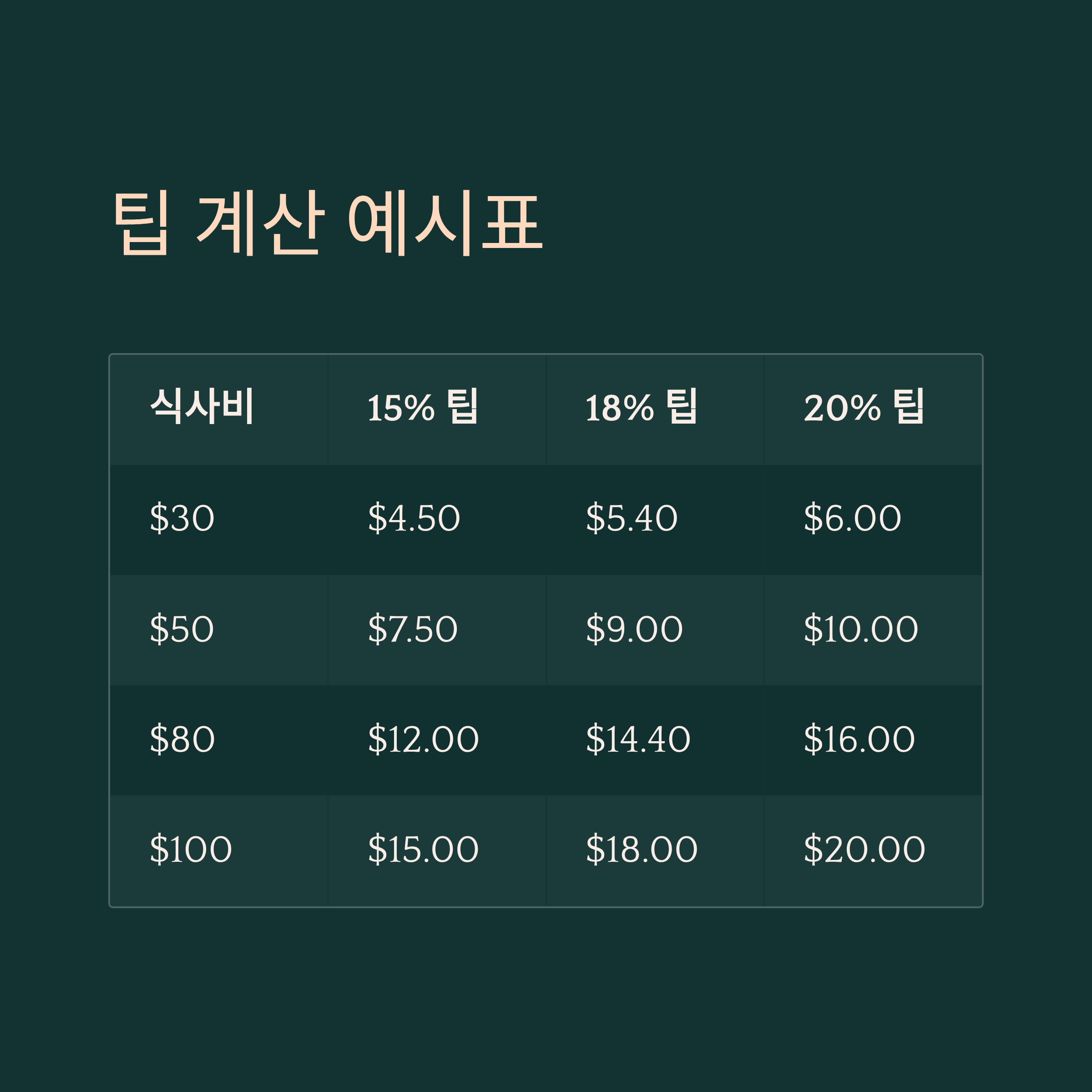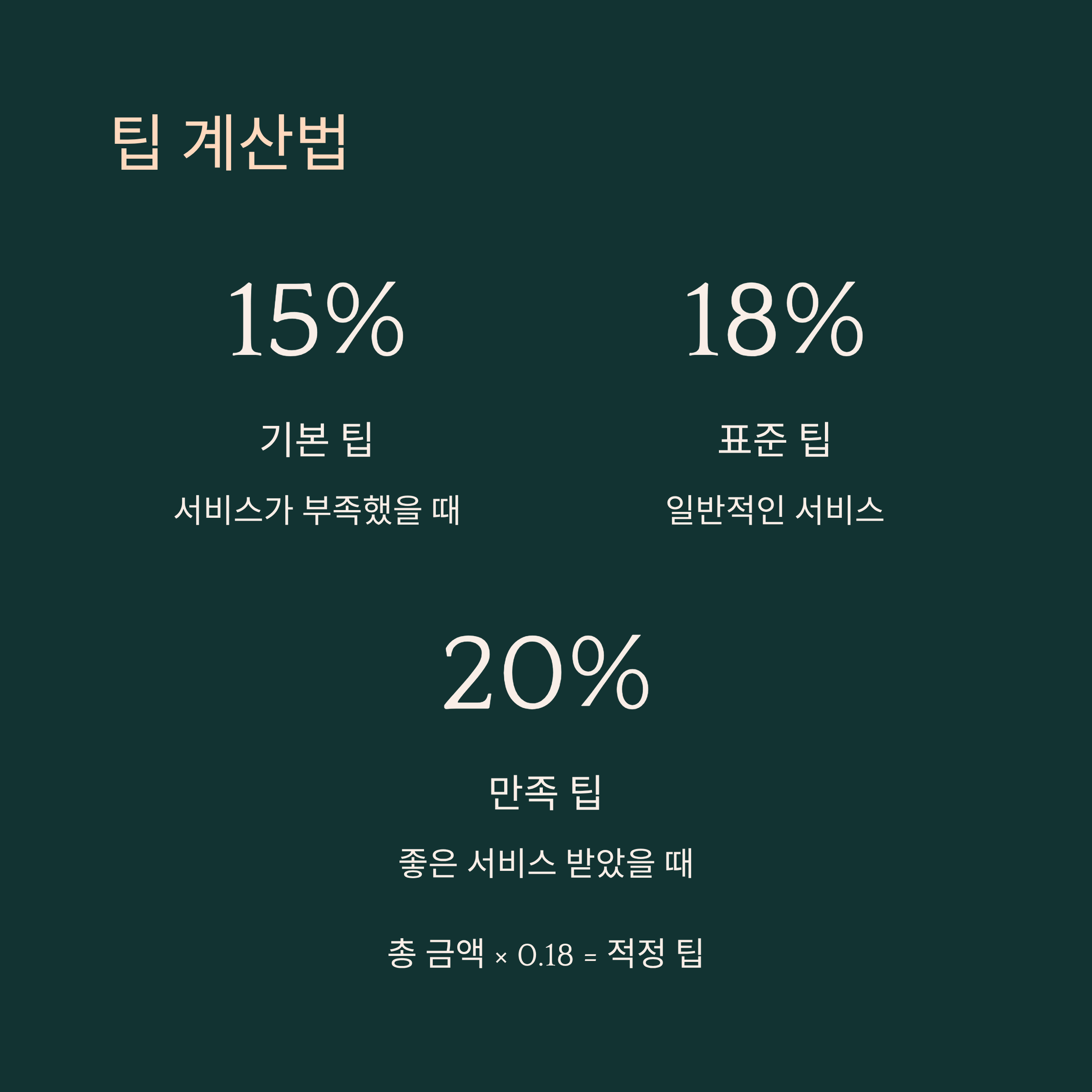 미국에서는 보통 음식값의 15%~20%를 팁으로 줘요. 서비스가 좋았을 땐 20% 이상, 보통일 경우 18%, 조금 부족했다면 15% 정도가 적당하죠. 하지만 10% 이하의 팁은 무례하게 받아들여질 수 있어서 되도록 피하는 게 좋아요.