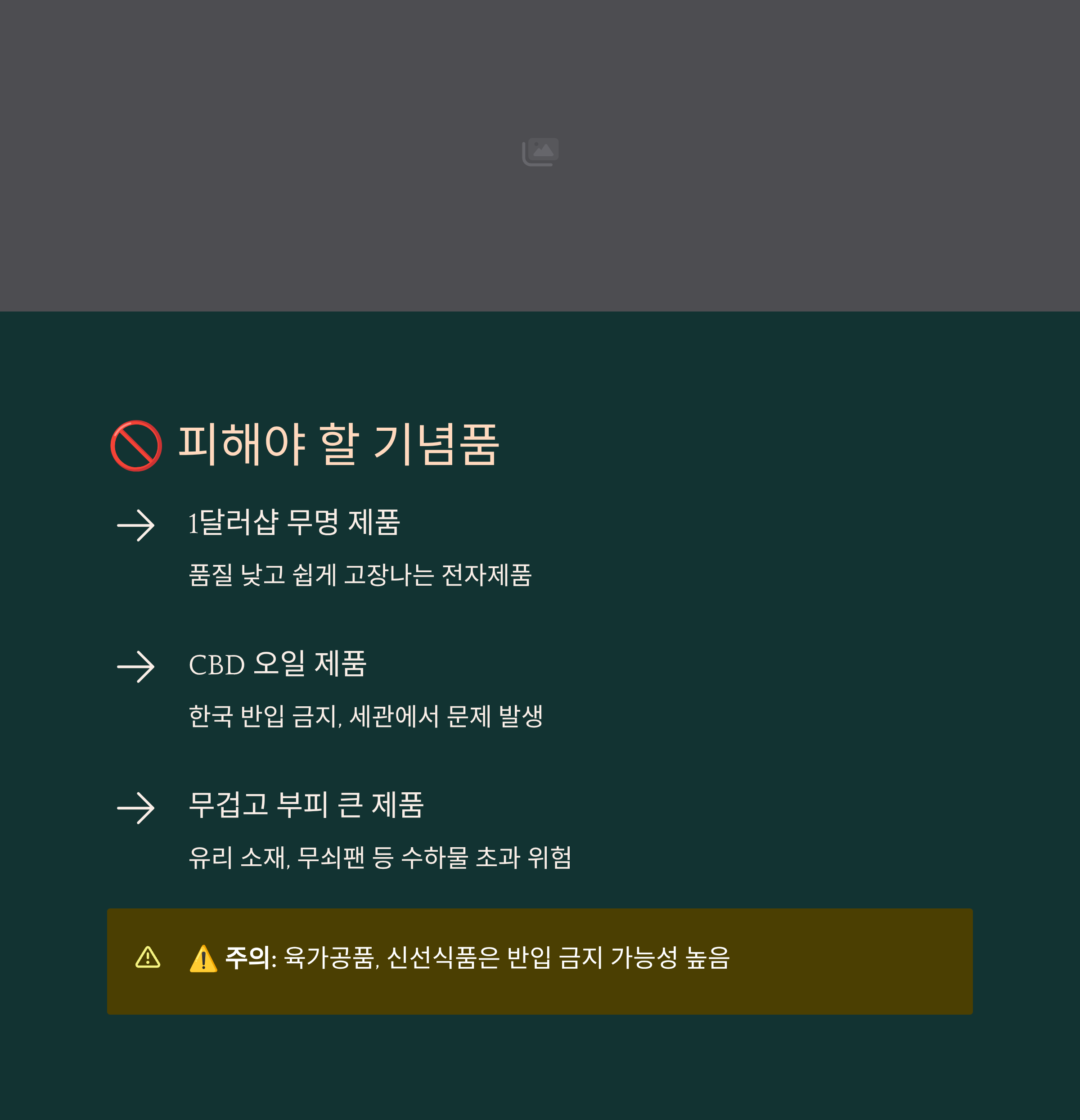 그리고 법적으로 제한된 품목도 있어요. 예를 들어 일부 약품, CBD 제품, 고기 성분이 든 식품 등은 한국 입국 시 문제가 될 수 있으니, 현지에서 아무리 인기 있어도 사지 않는 게 안전해요!