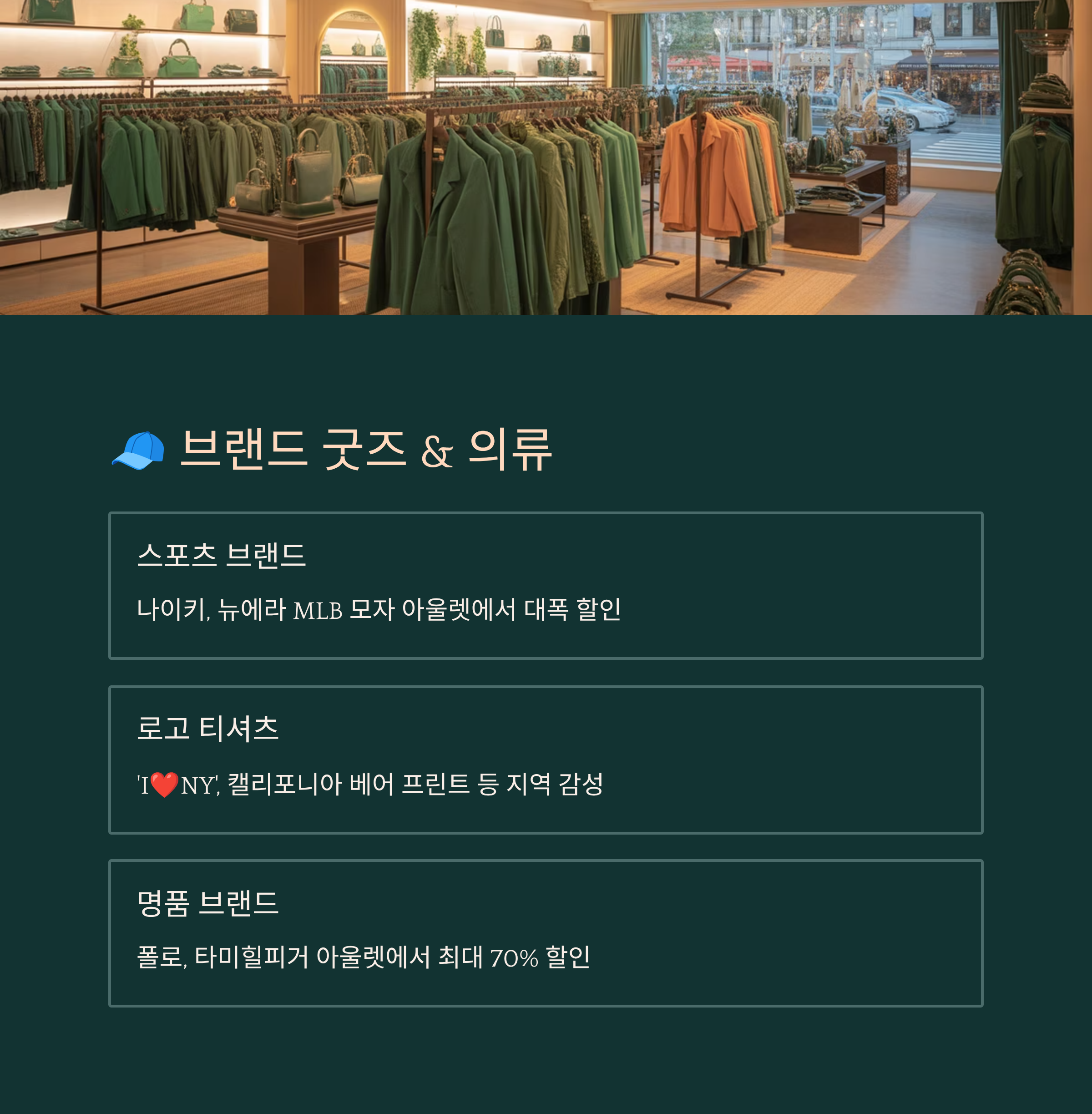 또한, 타미 힐피거, 캘빈 클라인, 폴로 랄프로렌 같은 브랜드는 아울렛에서 한국보다 30~70%까지 저렴하게 구매할 수 있어요. 특히 여행 중 아울렛 쇼핑은 많은 여행자들의 필수 코스죠.