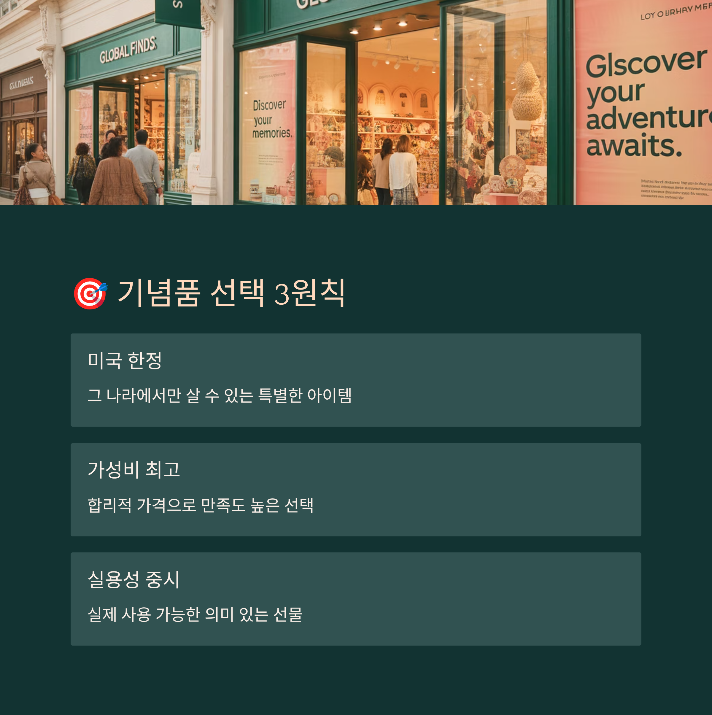 미국은 ‘실용적이고 의미 있는 선물’이라는 개념이 강해서, 기념품 하나를 고를 때도 오래 사용할 수 있고 실생활에 녹아드는 제품을 많이 선택해요. 쇼핑할 때도 "이걸 쓰는 상황을 그려보면 좋겠다"는 마음으로 고르면 성공 확률이 높답니다. 😉