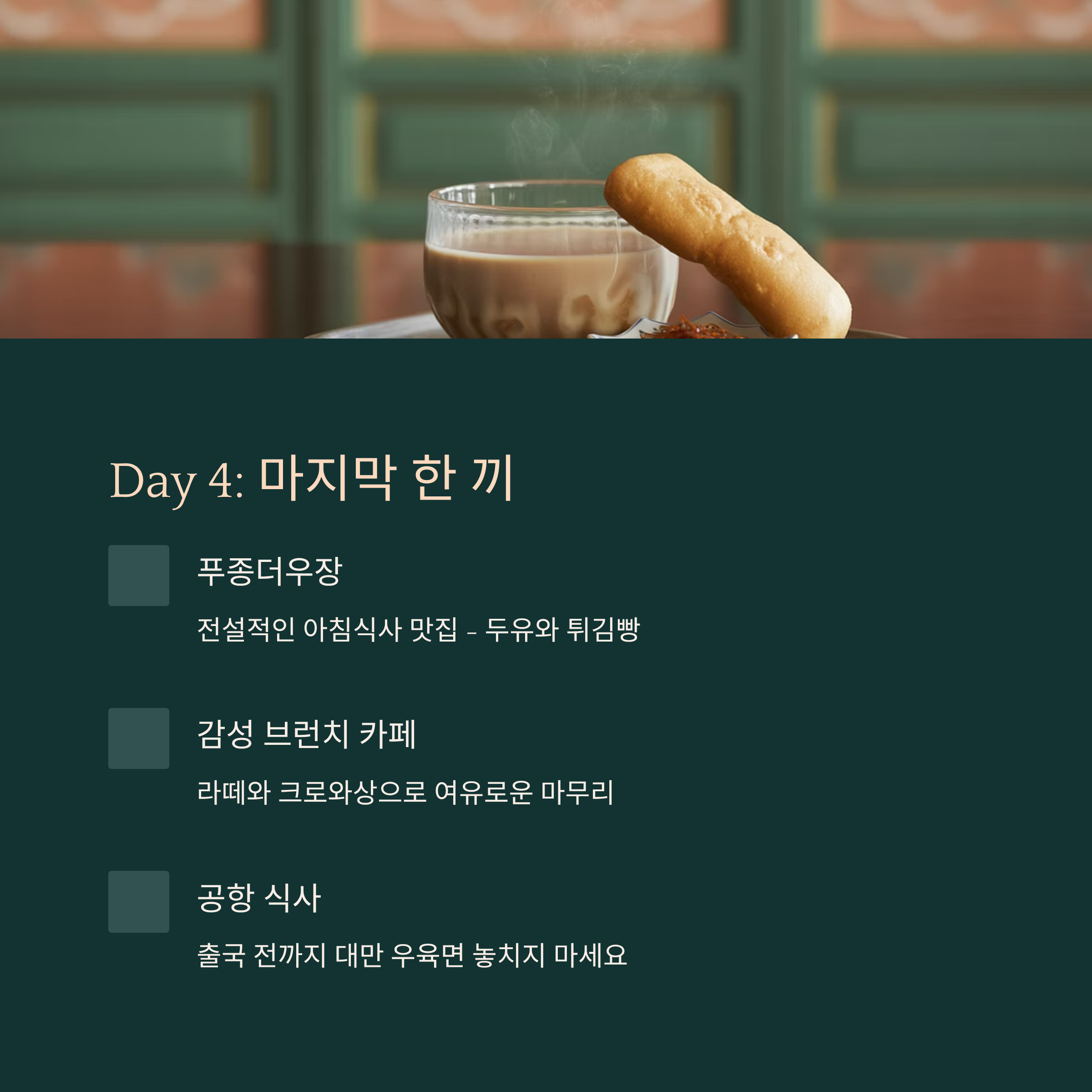 여행의 마지막 날, 아쉬움을 달래며 대만에서의 마지막 식사를 챙기는 날이에요. 비행기 시간에 따라 여유가 있다면 브런치 카페나 현지식 아침을 꼭 즐기고 가는 걸 추천해요! 대만의 아침 시장은 로컬 분위기가 진하게 느껴져서 여행 마무리에 제격이랍니다. ☕