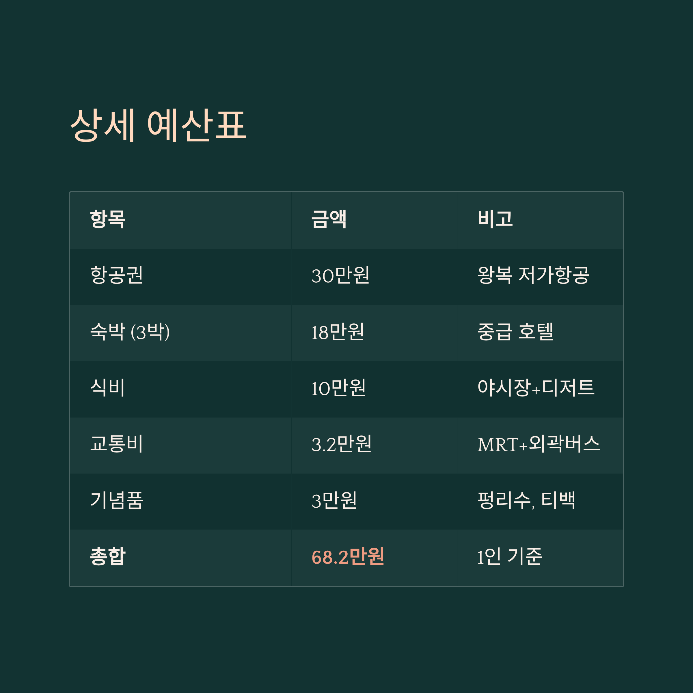 | 교통비 | ₩8,000 | ₩32,000 | MRT + 외곽 버스 |
