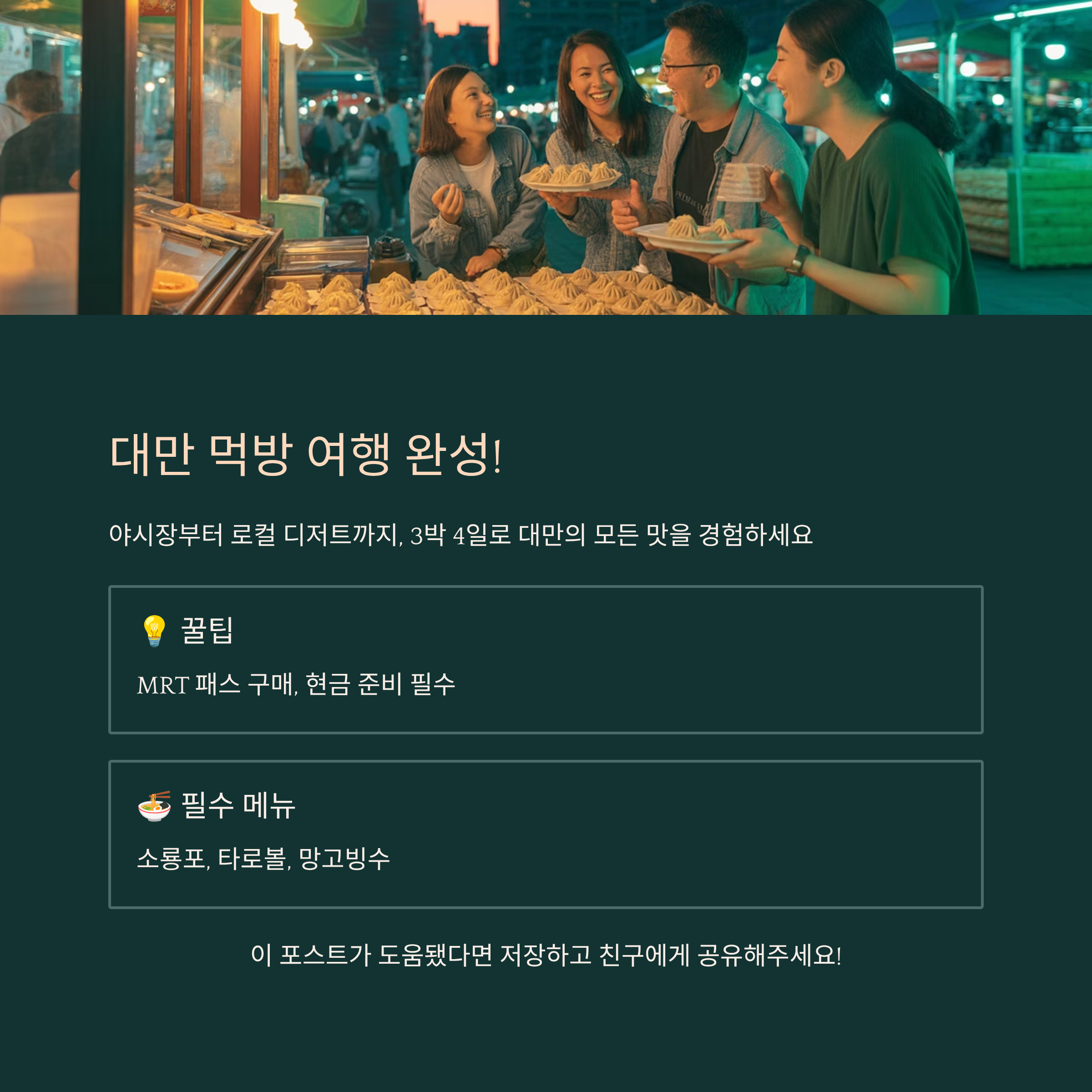 이 글에서는 3박 4일 동안 대만에서 효율적으로 먹방 중심 여행을 즐길 수 있는 일정을 소개하고, 각 일정별 대표 음식과 먹거리 추천은 물론! 전체 예산까지 꼼꼼히 정리해줄게요. 모바일에서도 보기 쉽게 구성했으니, 여행 떠나기 전 저장해두면 좋아요. 🍽️
