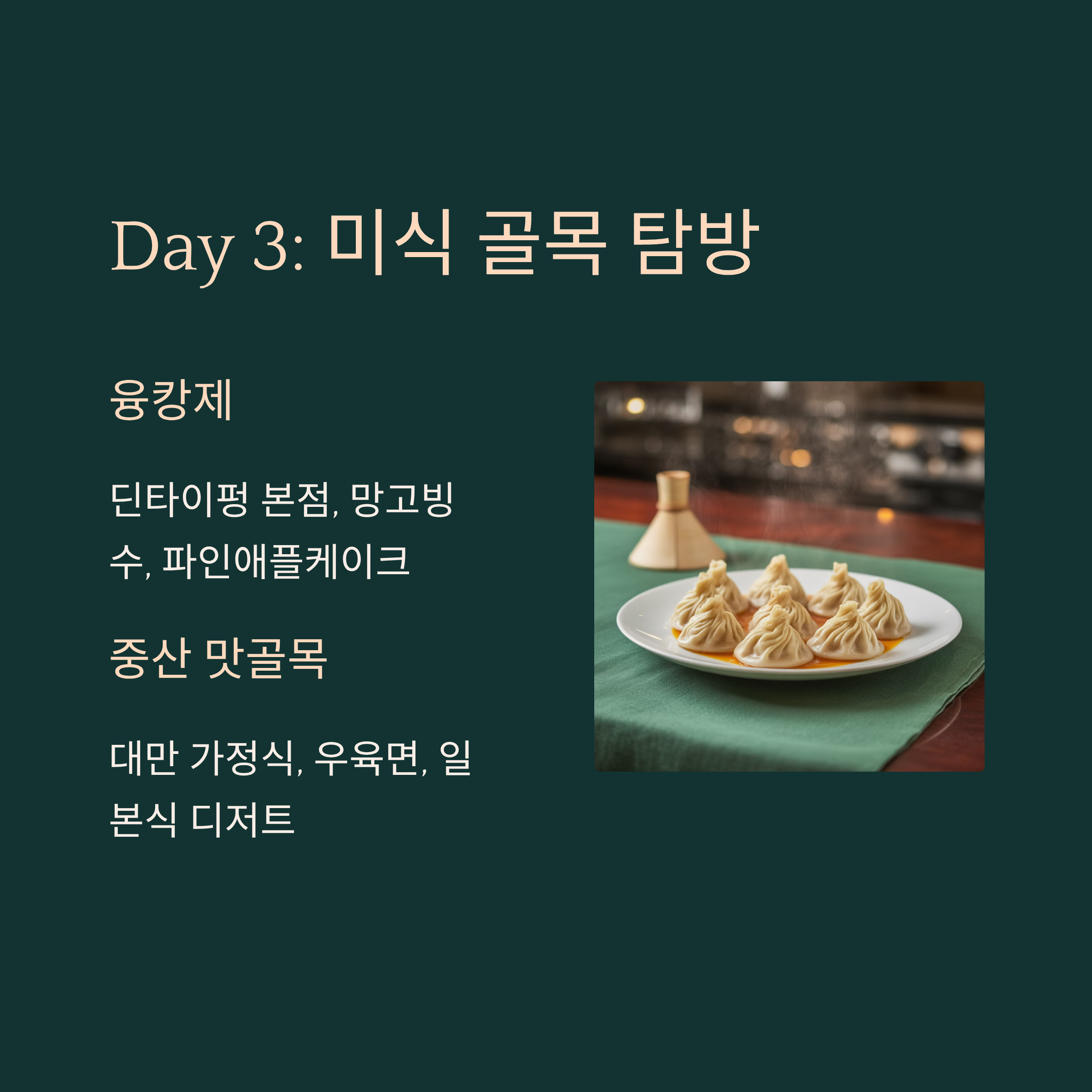 셋째 날은 본격적으로 타이베이 시내 곳곳의 숨은 미식 골목들을 탐방해볼 거예요! 대만 로컬 느낌이 물씬 나는 골목마다 보석처럼 숨은 맛집들이 숨어 있어서, 지도를 들고 탐험하듯 식도락 여행을 즐기면 딱 좋답니다. 🍜