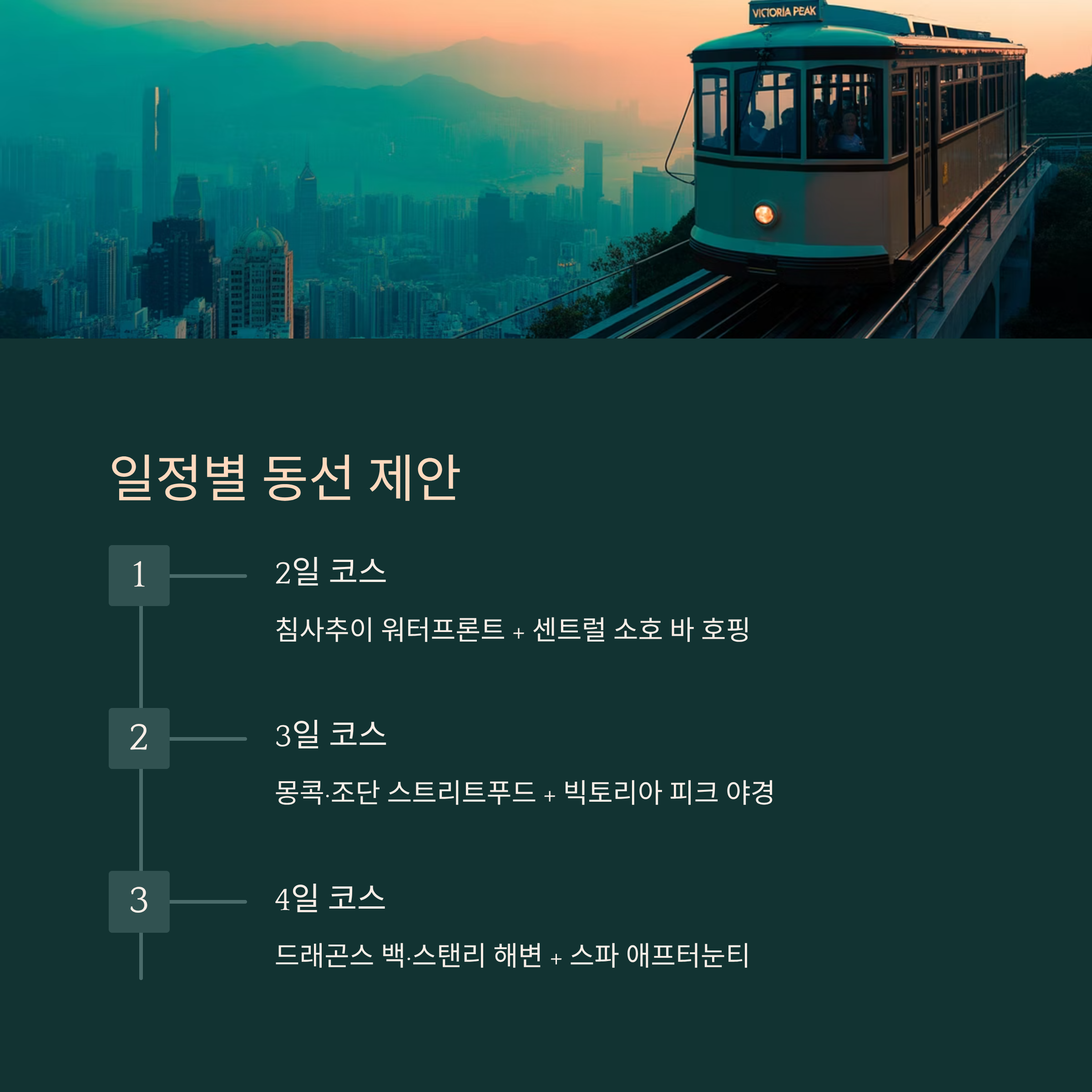 3일: 위 2일 코스에 몽콕·조단 스트리트푸드 라인업과 샴수이포 빈티지 쇼핑을 추가해요. 저녁은 피크트램 타임드 예약으로 빅토리아 피크 야경을 넣으면 만족도가 커요. 날씨가 흐리면 루프톱 대신 실내 라운지로 대체해요.