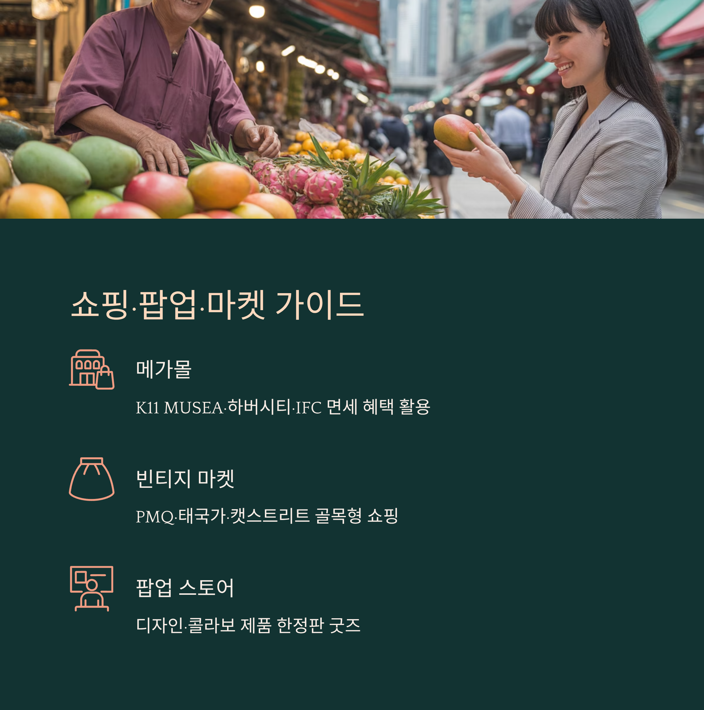 K11 MUSEA·하버시티·IFC·타임스퀘어 같은 메가몰과 PMQ·태국가·캣스트리트 마켓 같은 골목형 빈티지가 공존해요. 팝업은 디자인·콜라보 제품이 다수라서 한정판 굿즈 수집에 적합해요. 카드 결제는 탭이 일반적이고, 환불·교환 규정은 매장마다 달라요.