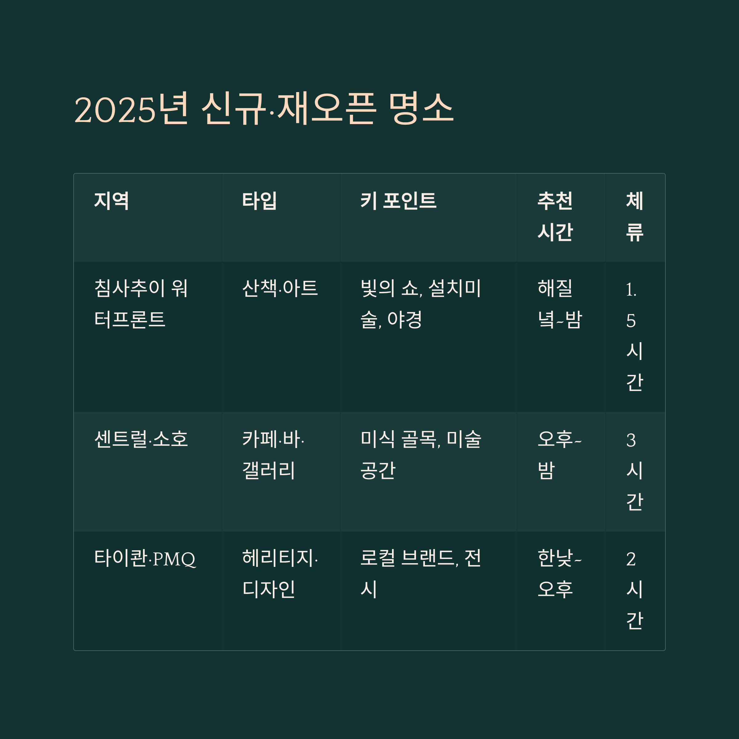 리노베이션을 마친 해변 산책 루트와 새로 꾸며진 갤러리·전망 스팟이 주목을 받아요. 침사추이 해안의 설치 미술 지점과 센트럴의 헤리티지 스페이스는 낮·밤 분위기가 달라서 두 번 가도 재미가 달라요. 어린이와 동행한다면 하버 인근 놀이터·스플래시 존이 있는 공원형 명소를 메인으로 잡아도 좋아요.