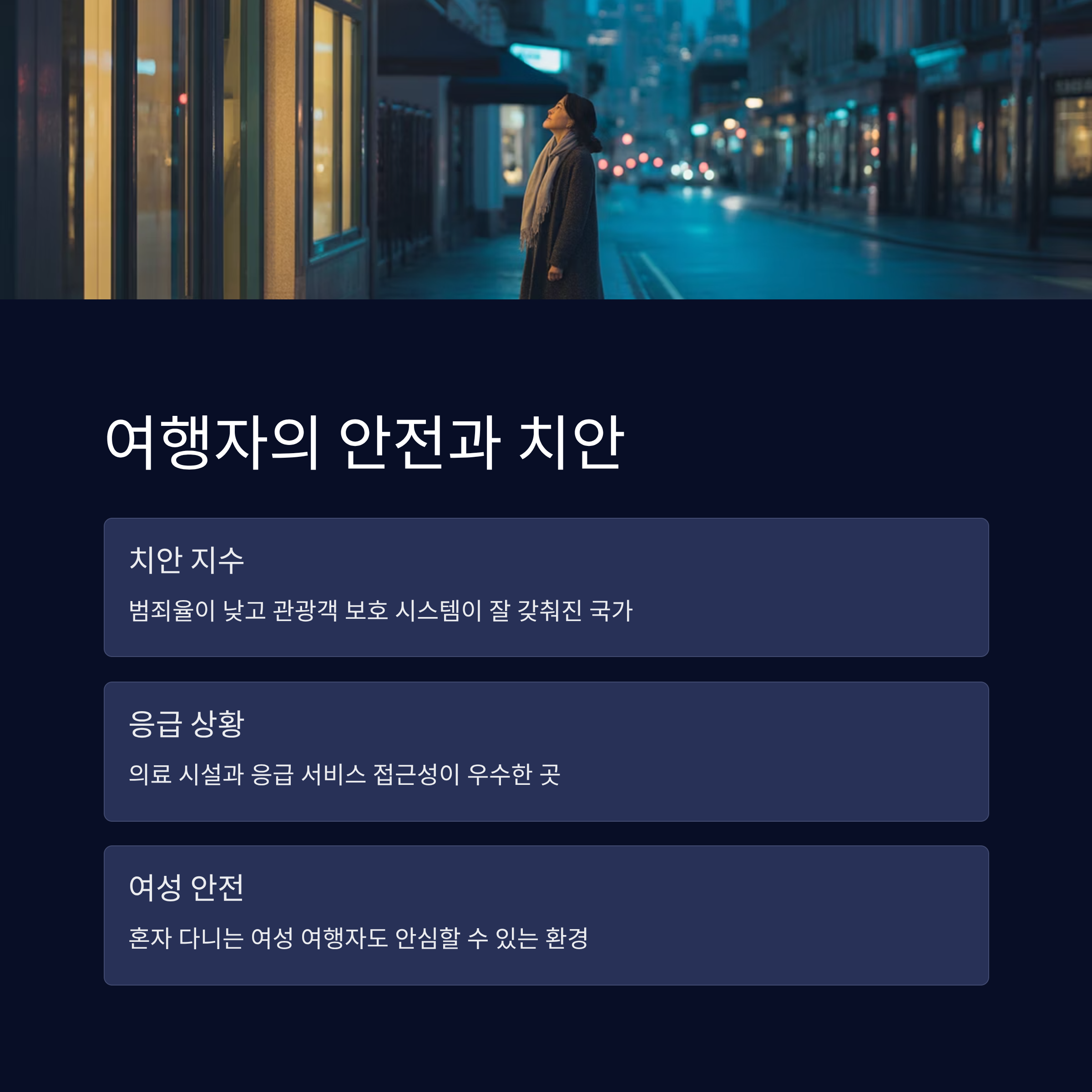 혼자 떠나는 해외여행에서 가장 중요한 건 안전이에요. 치안이 좋은 나라일수록 늦은 밤에도 안심하고 거리를 걸을 수 있고, 소지품을 잃어버릴 확률도 줄어들어요. 실제로 세계 평화 지수(Global Peace Index)에서 상위권에 오른 나라들은 혼자 여행하기에 적합한 경우가 많답니다. 예를 들어 아이슬란드, 덴마크, 뉴질랜드 같은 국가는 범죄율이 낮고 경찰 대응도 신속해요.