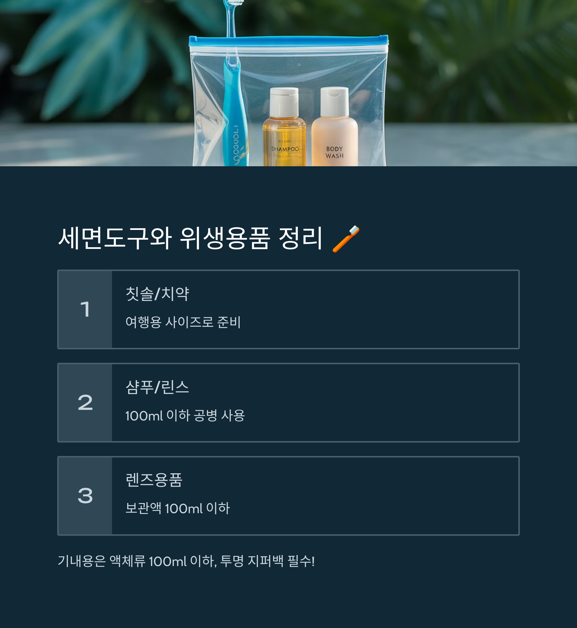 | 칫솔/치약 | 여행용 사이즈 | ✅ |