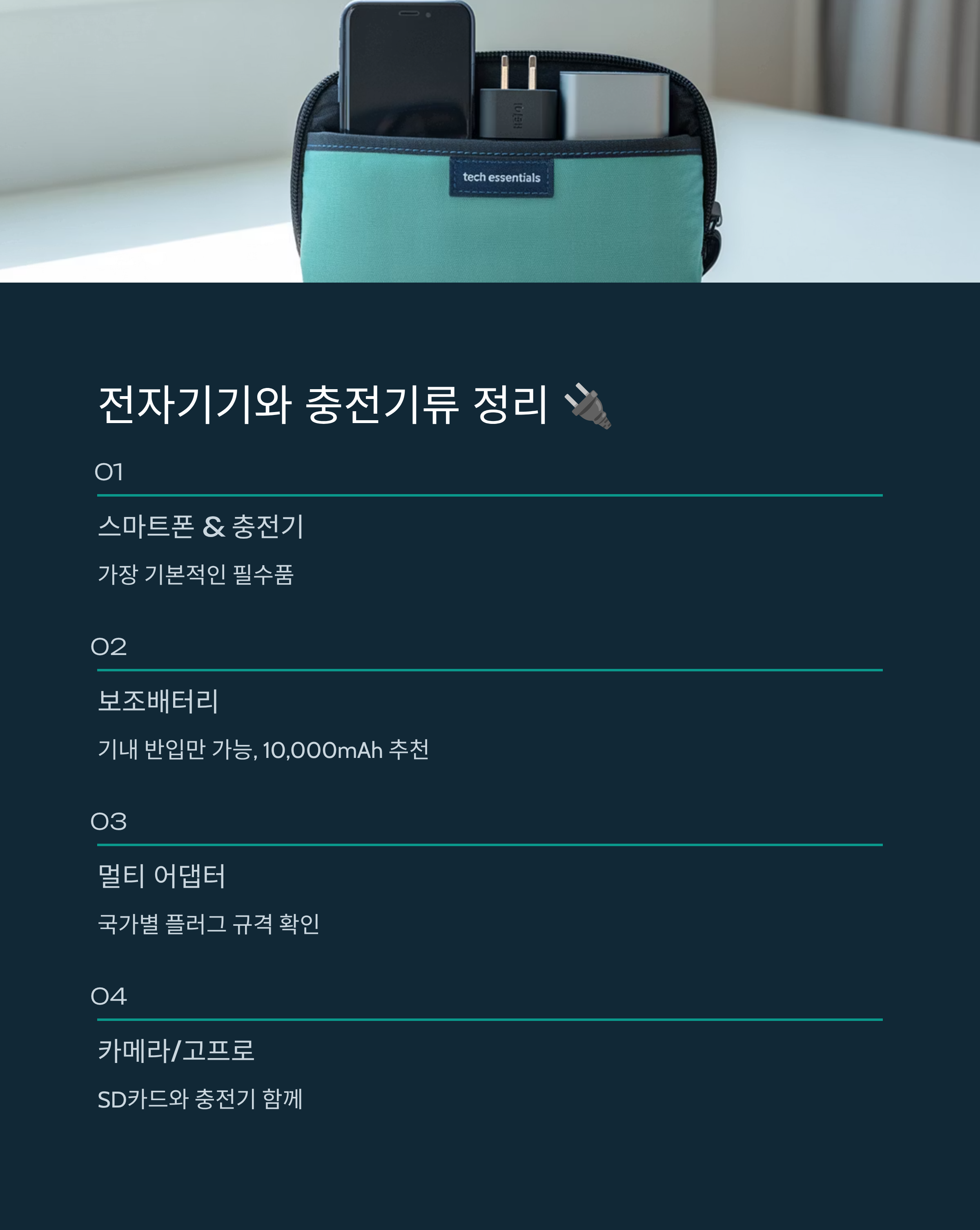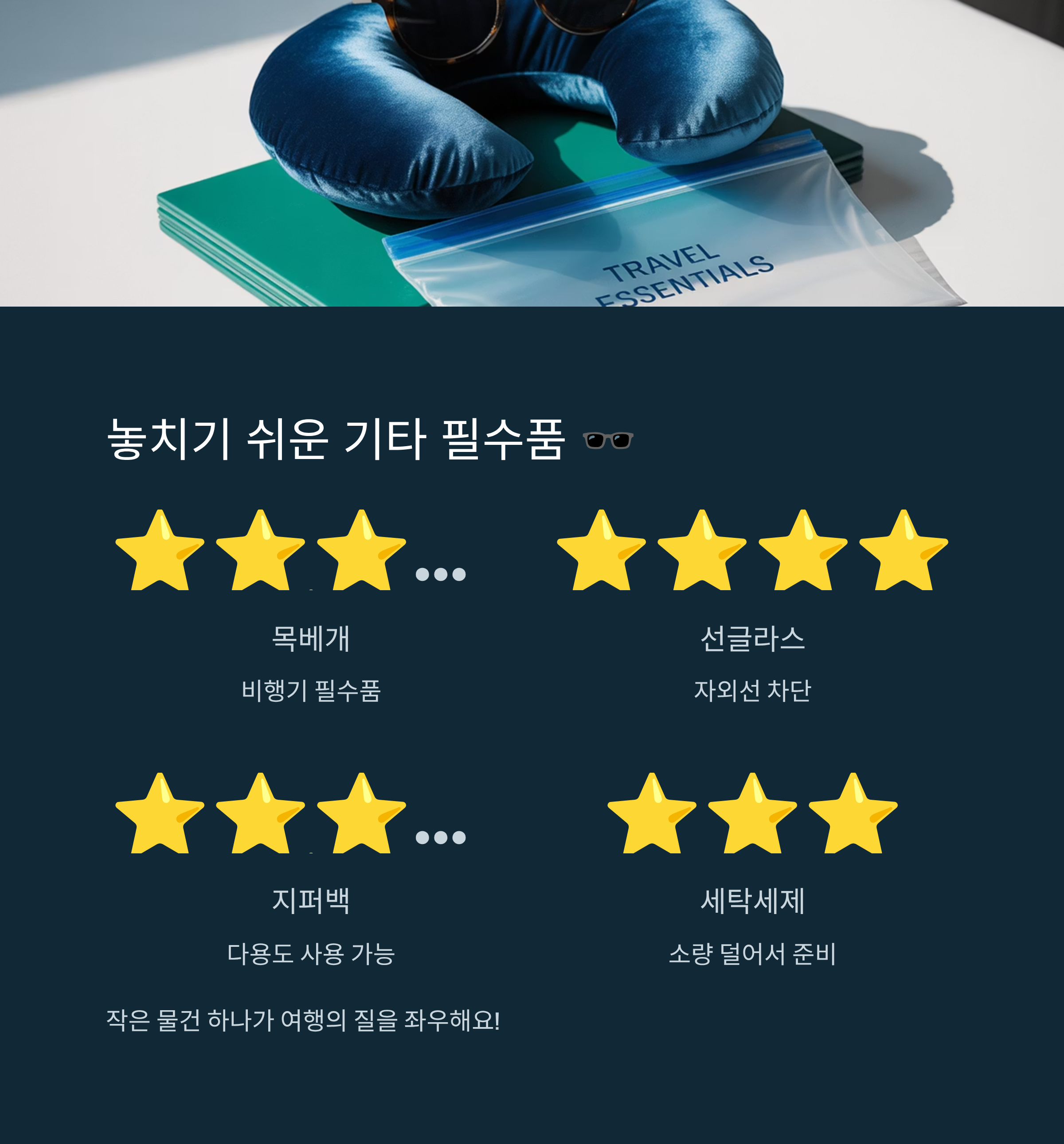 작은 물건 하나가 여행의 질을 좌우할 수 있어요. 그래서 이 ‘기타 필수품’ 리스트도 꼭 체크해보는 걸 추천해요 🌍