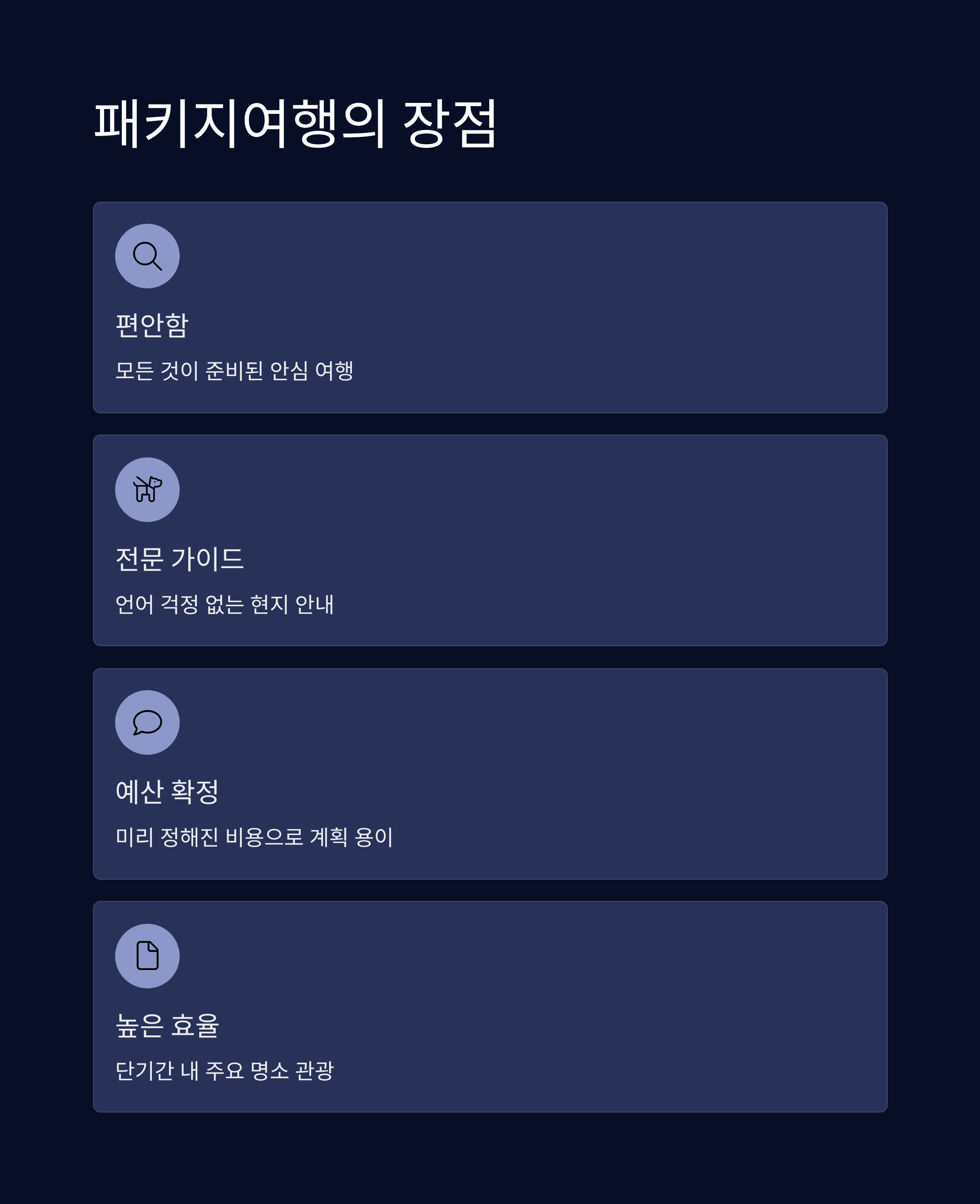비용도 일괄적으로 제시되기 때문에 예산을 계획하기 좋아요. 여행 전 모든 비용이 확정되어 있어 추가 지출이 적고, 일부 단체 할인 혜택까지 받아서 오히려 더 경제적인 경우도 있어요.