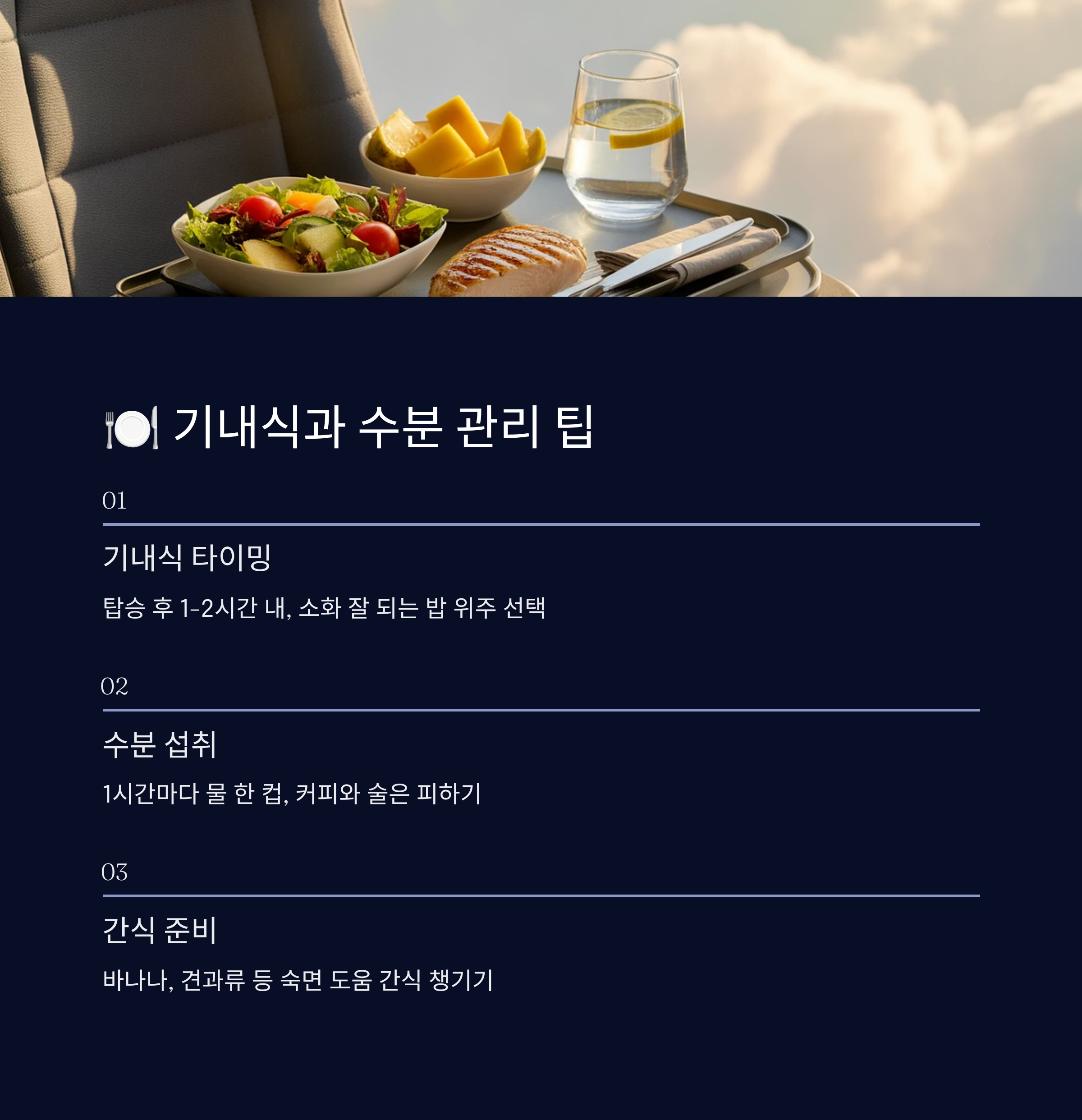 | 기내식 | 너무 늦게 먹거나 과식하면 위 불편 | 밥 위주 메뉴 선택 |