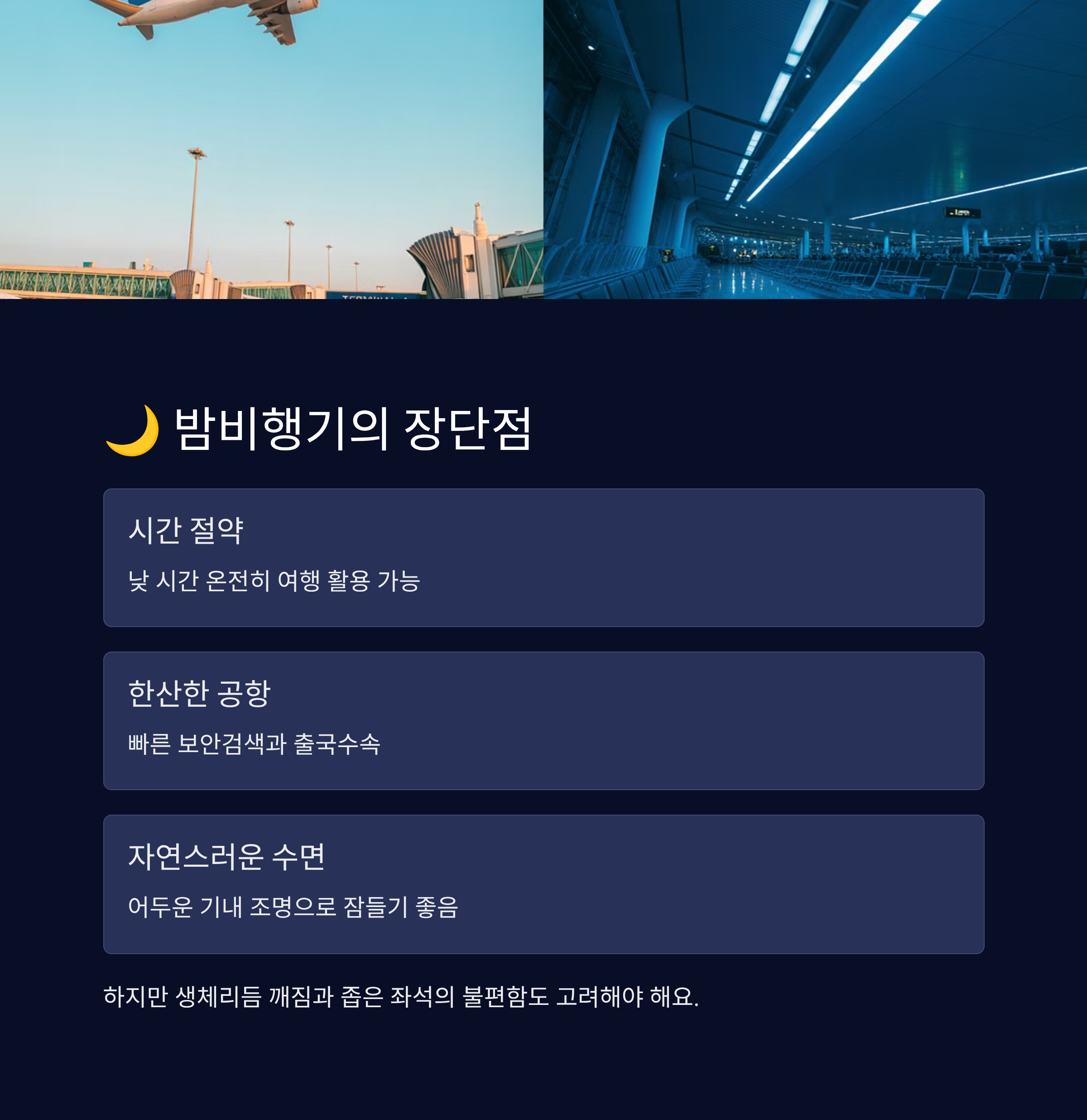또한 밤에는 공항이 비교적 한산해서 보안 검색이나 출국 수속도 빠르게 진행되는 경우가 많아요. 아이가 있는 가족이나 노년층과 함께하는 여행이라면 대기 시간이 줄어드는 것만으로도 스트레스가 확 줄죠. 게다가 밤에는 기내 조명이 낮춰져서 자연스럽게 잠들기에도 좋아요.