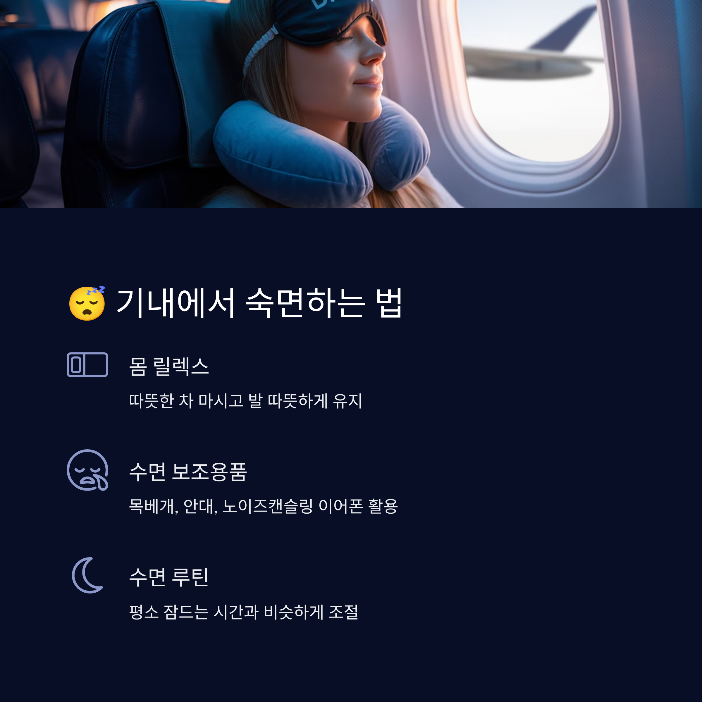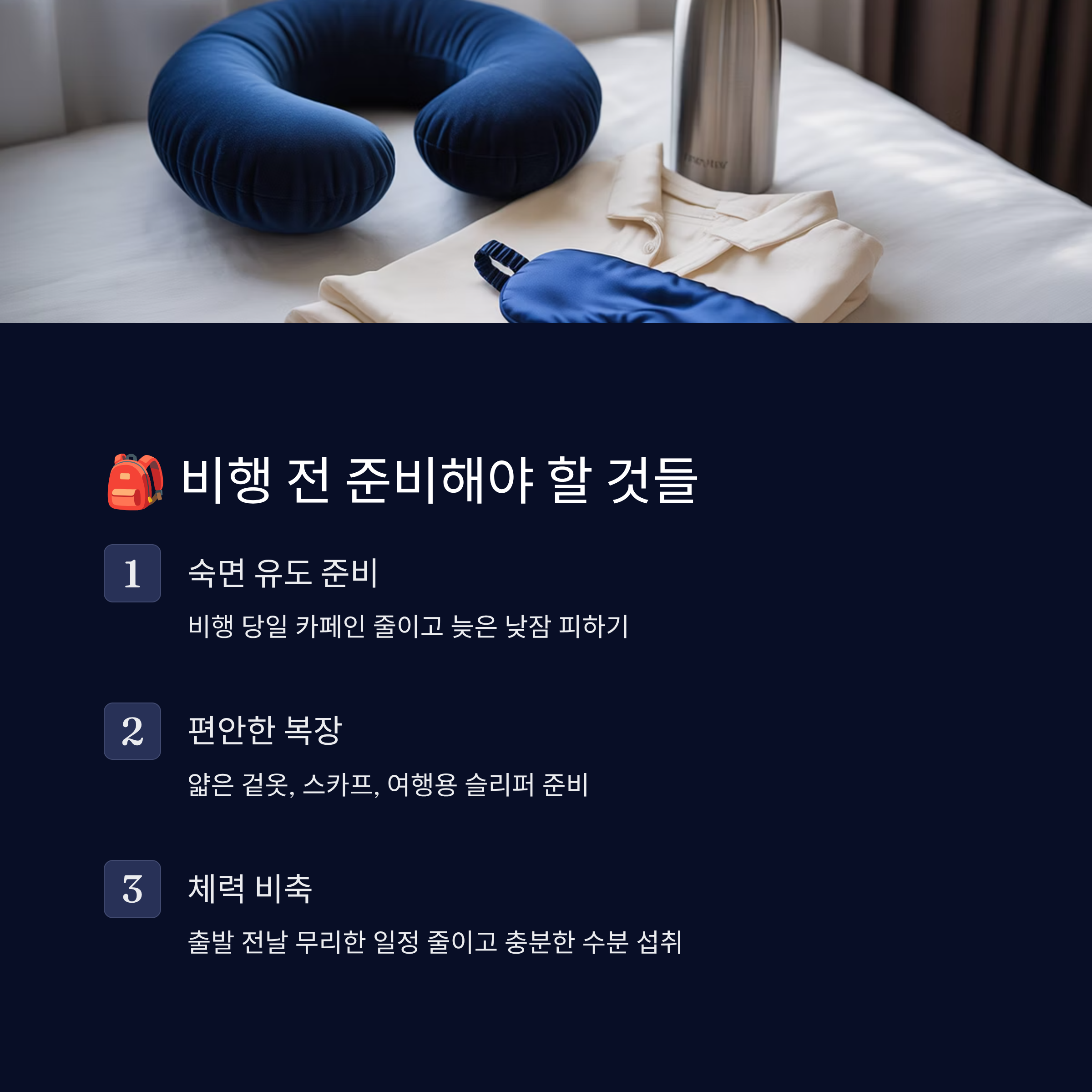 이렇게 수면 환경을 스스로 만드는 게 진짜 중요해요. 비행기에서 쪽잠만 자도 도착 후 피로도가 완전히 달라지거든요! 💤