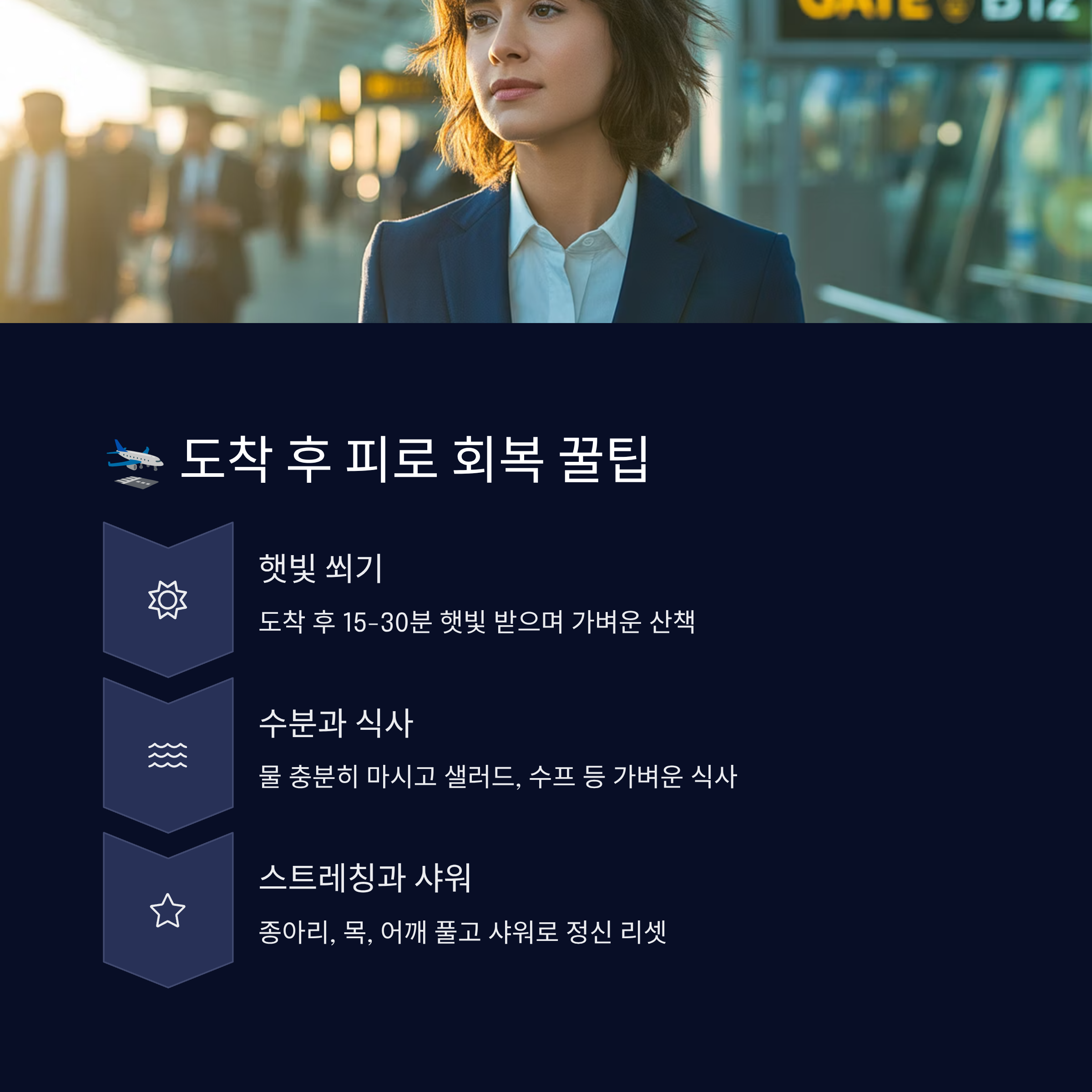 | 햇빛 받기 | 생체 리듬 회복 | 도착 후 30분 이내 |