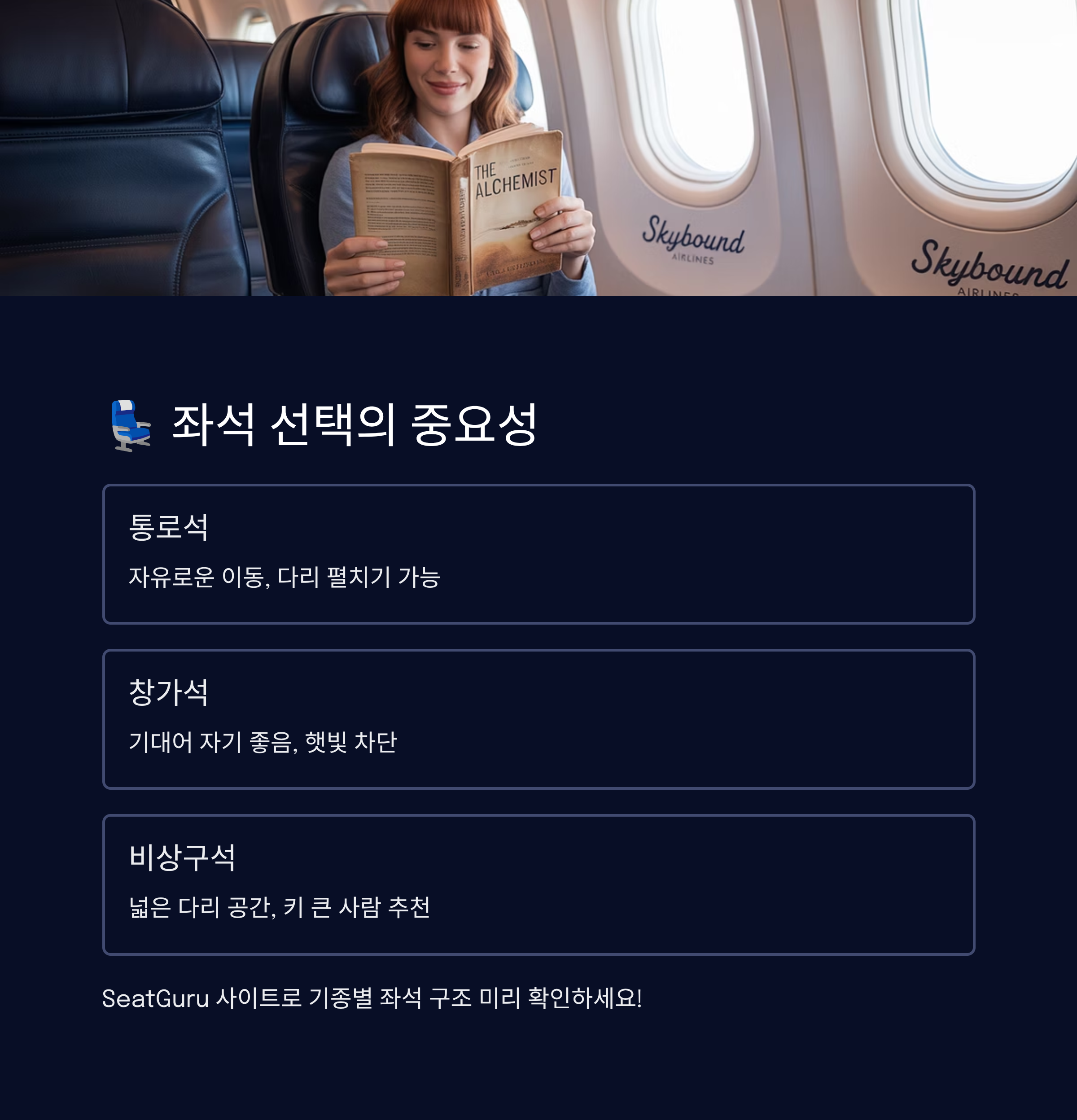 좋은 좌석 선택은 좋은 비행 경험의 시작이에요. 여행 예약할 때 항공권만 신경 쓰지 말고 좌석도 꼼꼼히 살펴보세요! 💺💤