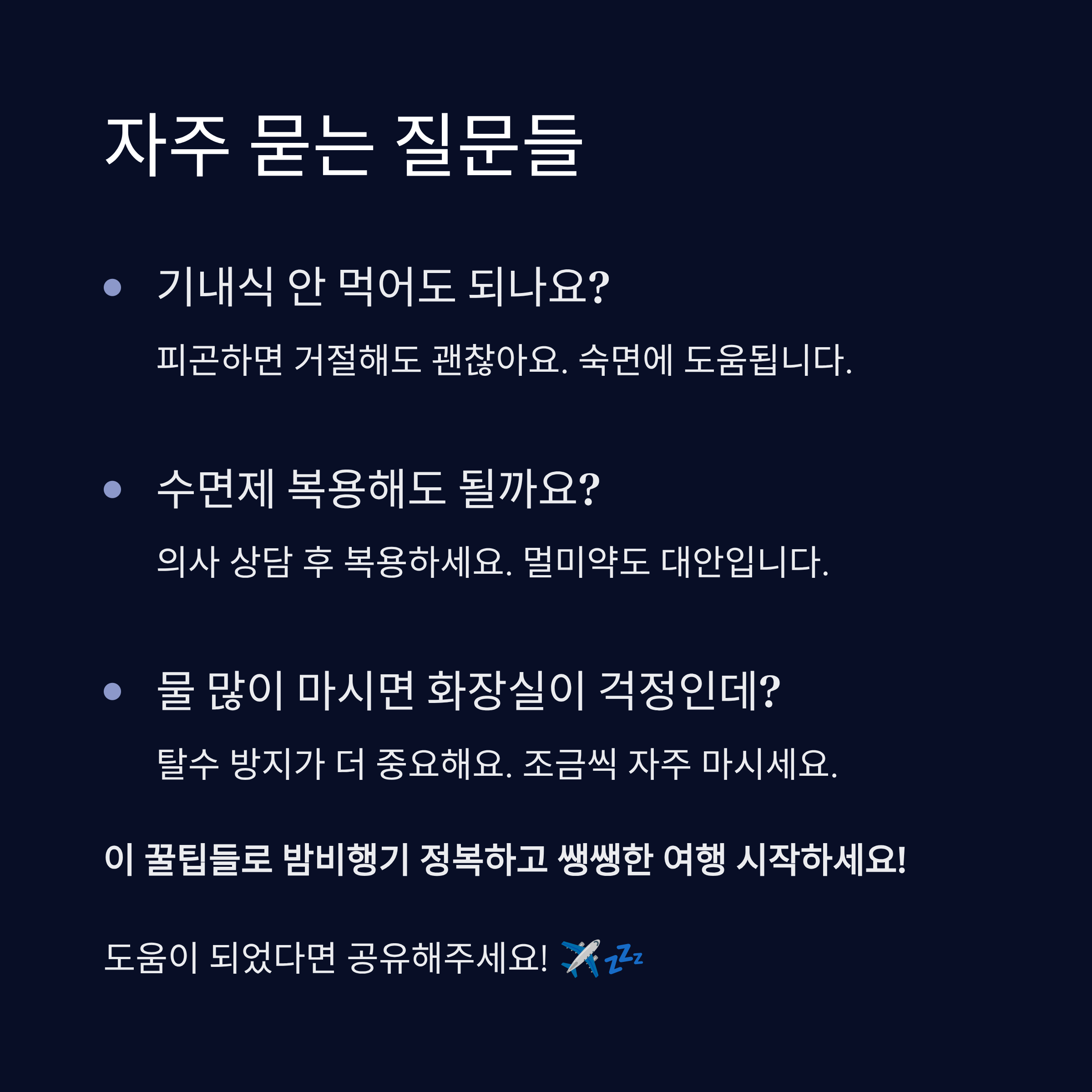 밤비행기를 탈 때 기내식과 수분 섭취는 생각보다 컨디션에 큰 영향을 줘요. 특히 자기 전에 먹는 음식은 위에 부담을 줄 수 있으니, ‘먹는 타이밍’과 ‘음식 종류’에 조금만 신경 써도 몸이 훨씬 편안해져요.