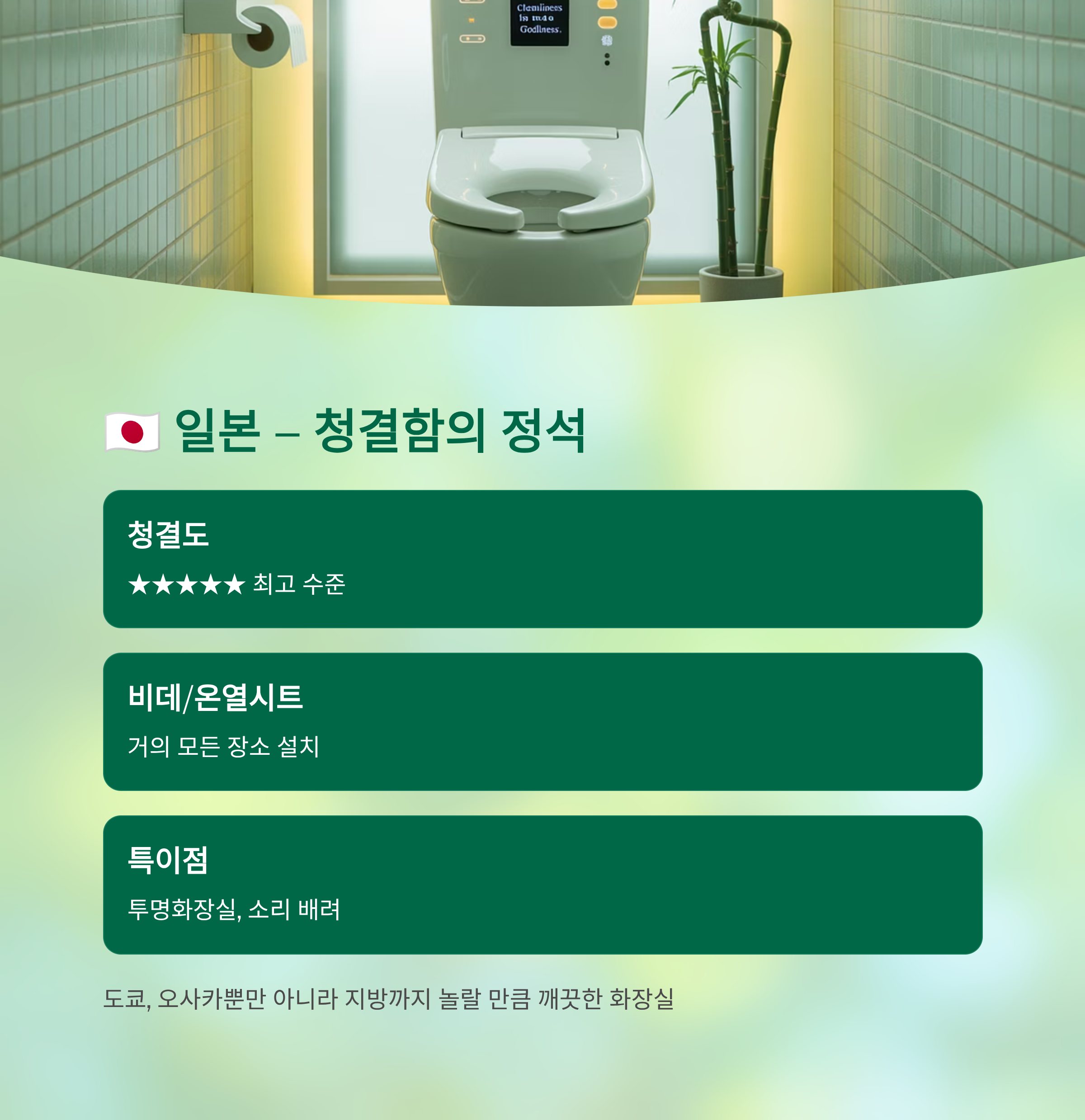 그래서 오늘은 여행자들이 "화장실 때문에 스트레스 안 받는 나라" TOP5를 정리해봤어요. 공중화장실의 청결도, 접근성, 기술력 등을 기준으로 평가했답니다. 여행지에서 화장실 찾느라 헤매지 않게 꼭 참고해보세요! 🚽✨