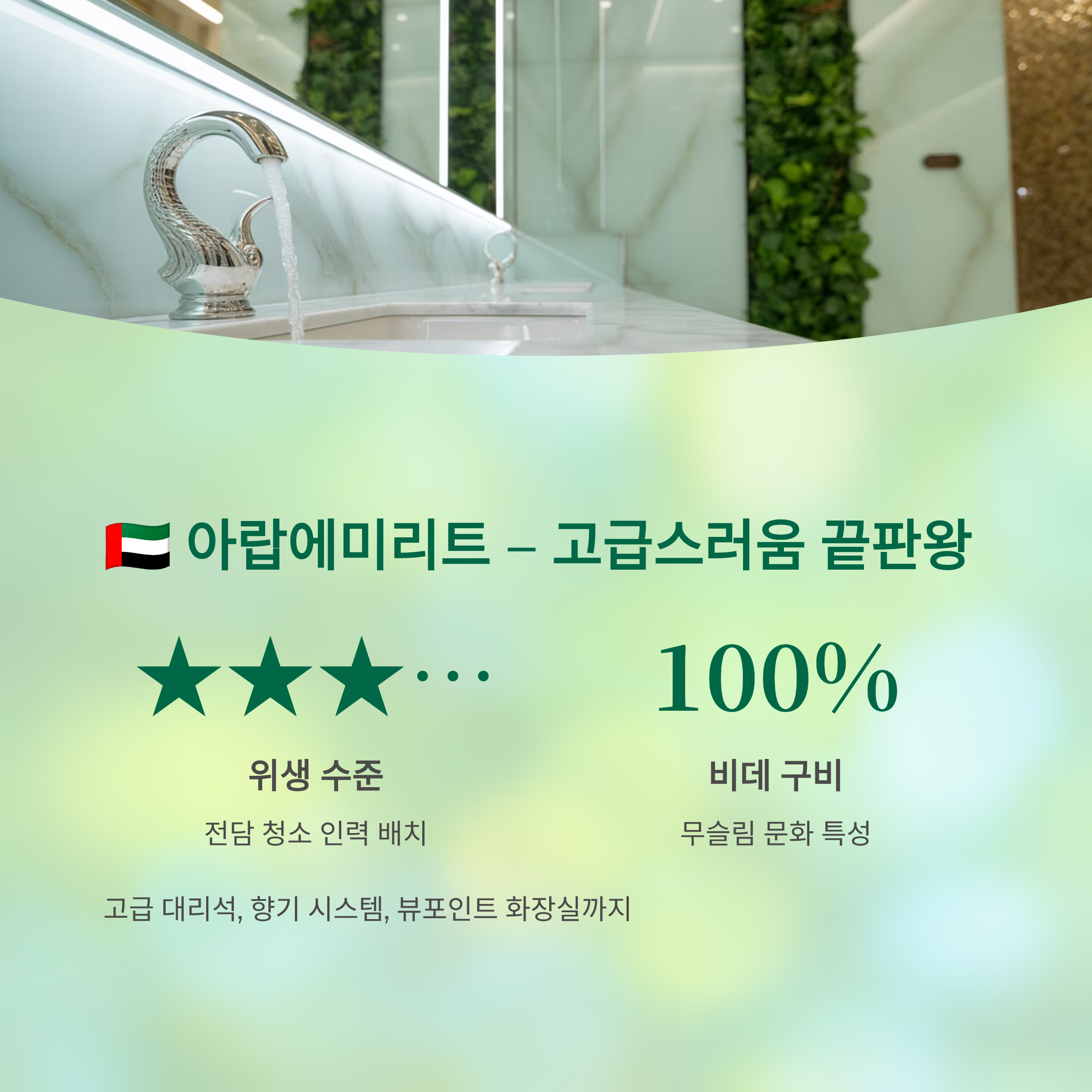 아랍에미리트, 특히 두바이와 아부다비는 ‘고급스러움’ 하면 빠질 수 없는 도시들이에요. 그 명성답게 화장실 수준도 일반적인 여행자의 상상을 초월할 정도로 화려하고 쾌적하답니다.