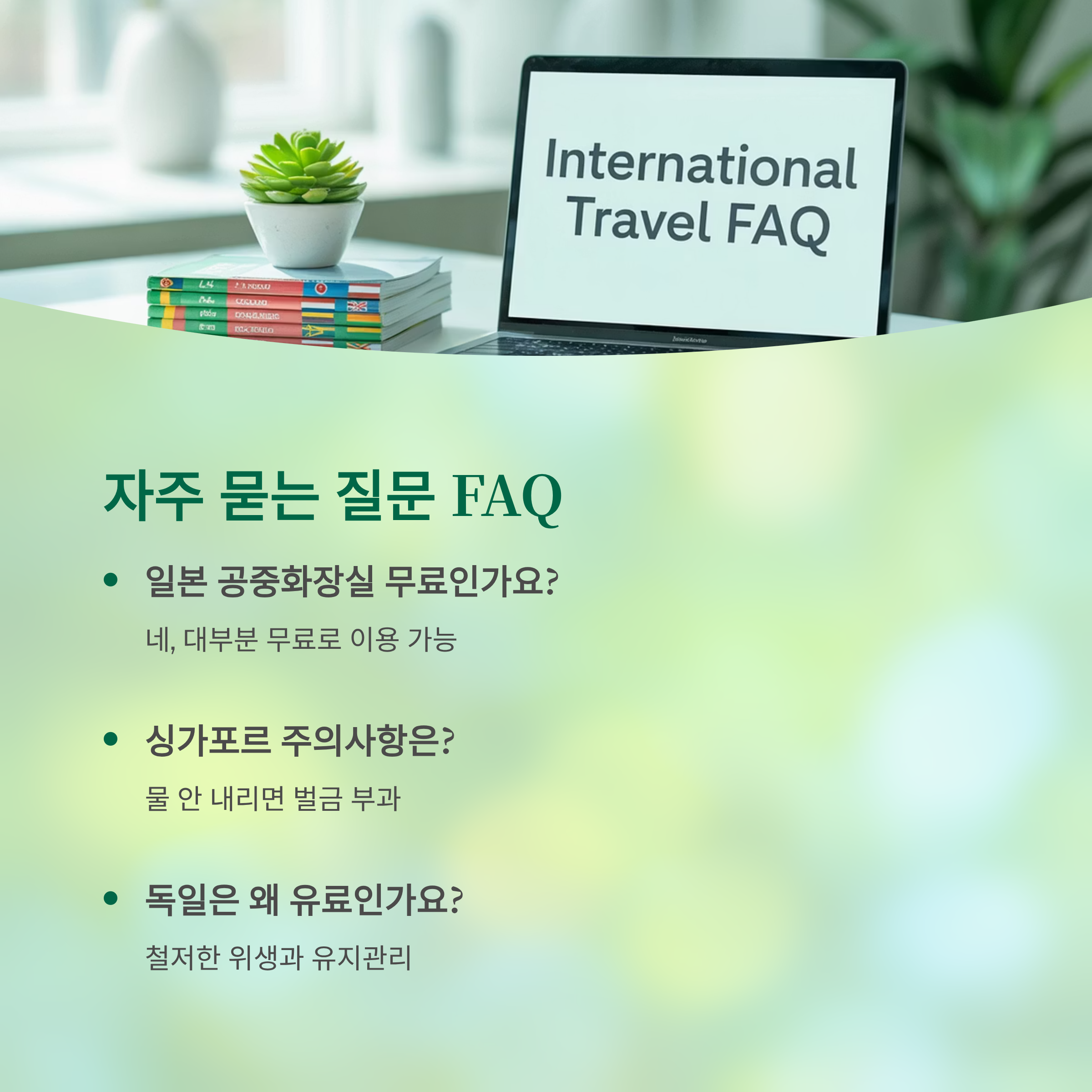 A7. 일본, 싱가포르, 독일, 스웨덴, UAE 모두 치안이 좋은 나라들이라 화장실 이용 시 큰 걱정 없어요. 사람이 많은 곳에서 이용하는 게 좋아요.