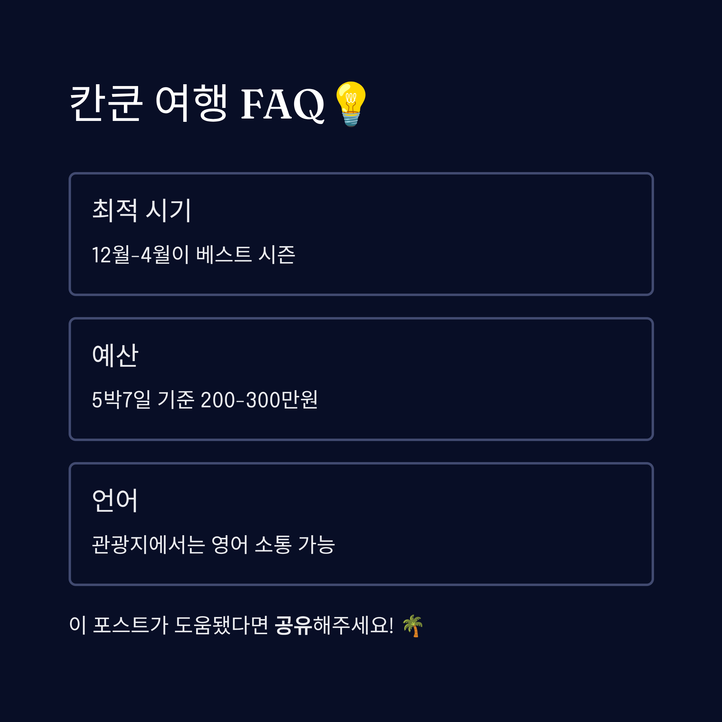 칸쿤은 ‘그냥 가도 재밌는 여행지’가 맞지만, 몇 가지 꿀팁만 알면 훨씬 더 똑똑하고 알차게 즐길 수 있어요! 처음 방문하는 사람들에게 유용한 정보들만 쏙쏙 골라 정리했어요. 돈 아끼는 방법부터 안전, 교통까지 한눈에 보기 쉽게 알려줄게요.