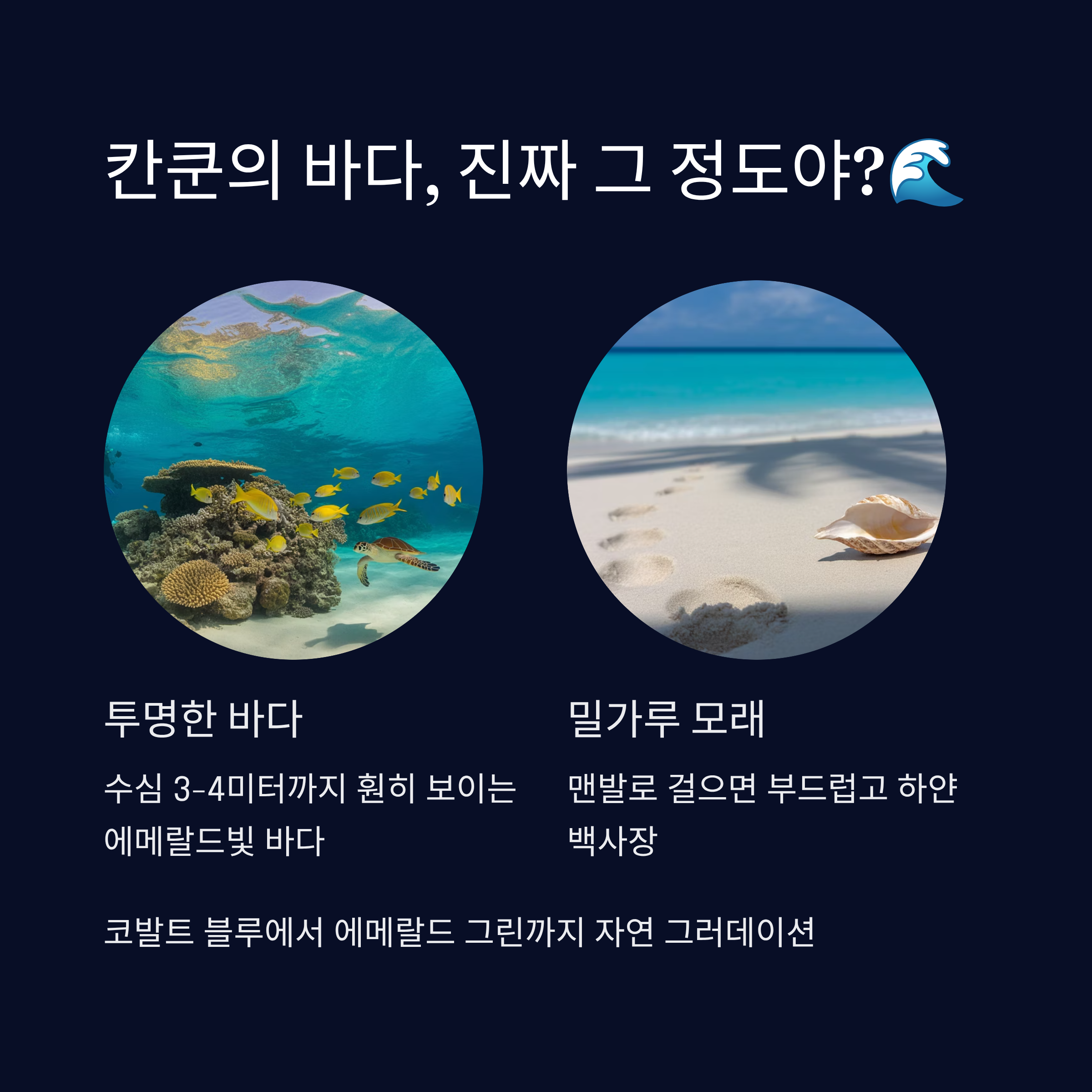 칸쿤의 바다는 그냥 풍경이 아니라 직접 '느껴야' 이해되는 감동이 있어요. 눈으로 보는 것만큼, 발로 밟고 피부로 닿는 그 물결이 주는 느낌은 평생 기억에 남을 거예요🌴.