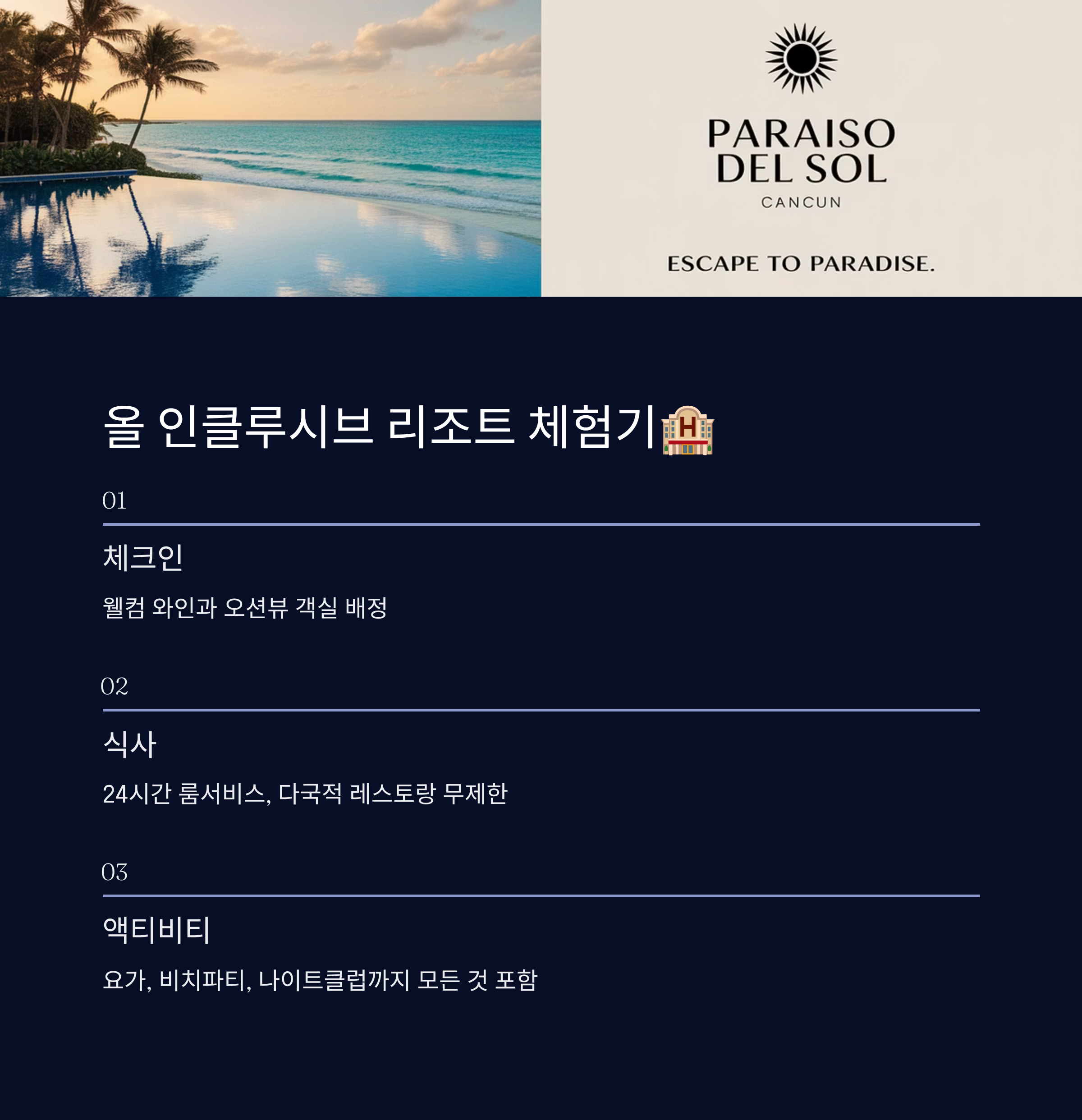 칸쿤에서 가장 유명한 숙소 유형은 단연 ‘올 인클루시브(All-Inclusive)’ 리조트예요. 말 그대로 숙박, 식사, 음료, 주류, 액티비티까지 전부 포함된 서비스라, 한 번 체크인 하면 지갑을 꺼낼 일이 거의 없어요. 그 자체가 ‘힐링’이 되는 시스템이랄까요?