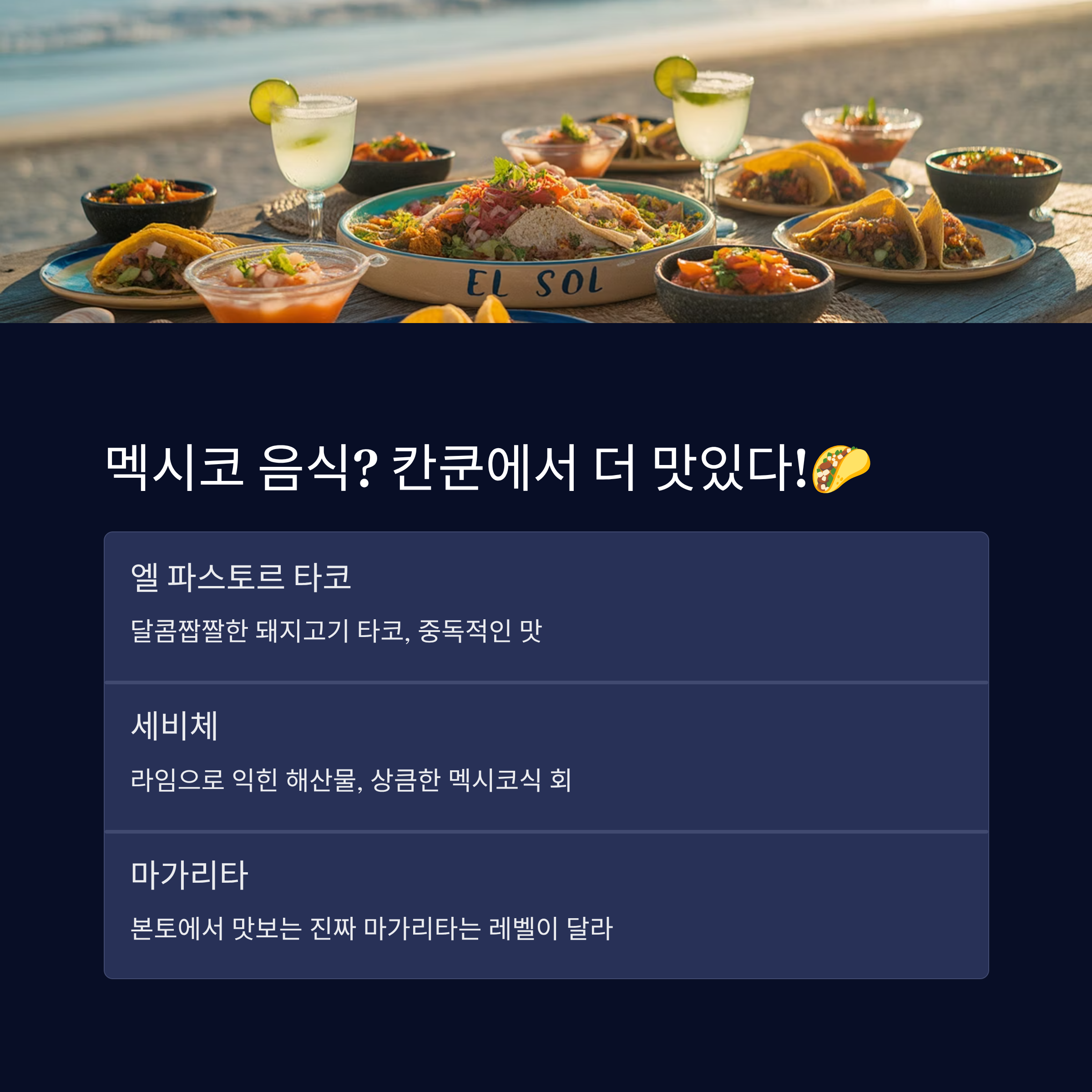칸쿤에 간다면 절대 놓치면 안 되는 게 바로 '먹방 여행'이에요! 멕시코 음식이 원래 매력 넘치지만, 칸쿤은 전 세계 관광객을 맞이하는 도시답게 퀄리티도 높고 플레이팅도 예술이에요. 먹는 재미가 여행의 절반 이상을 차지한다고 해도 과언이 아닐 정도예요.