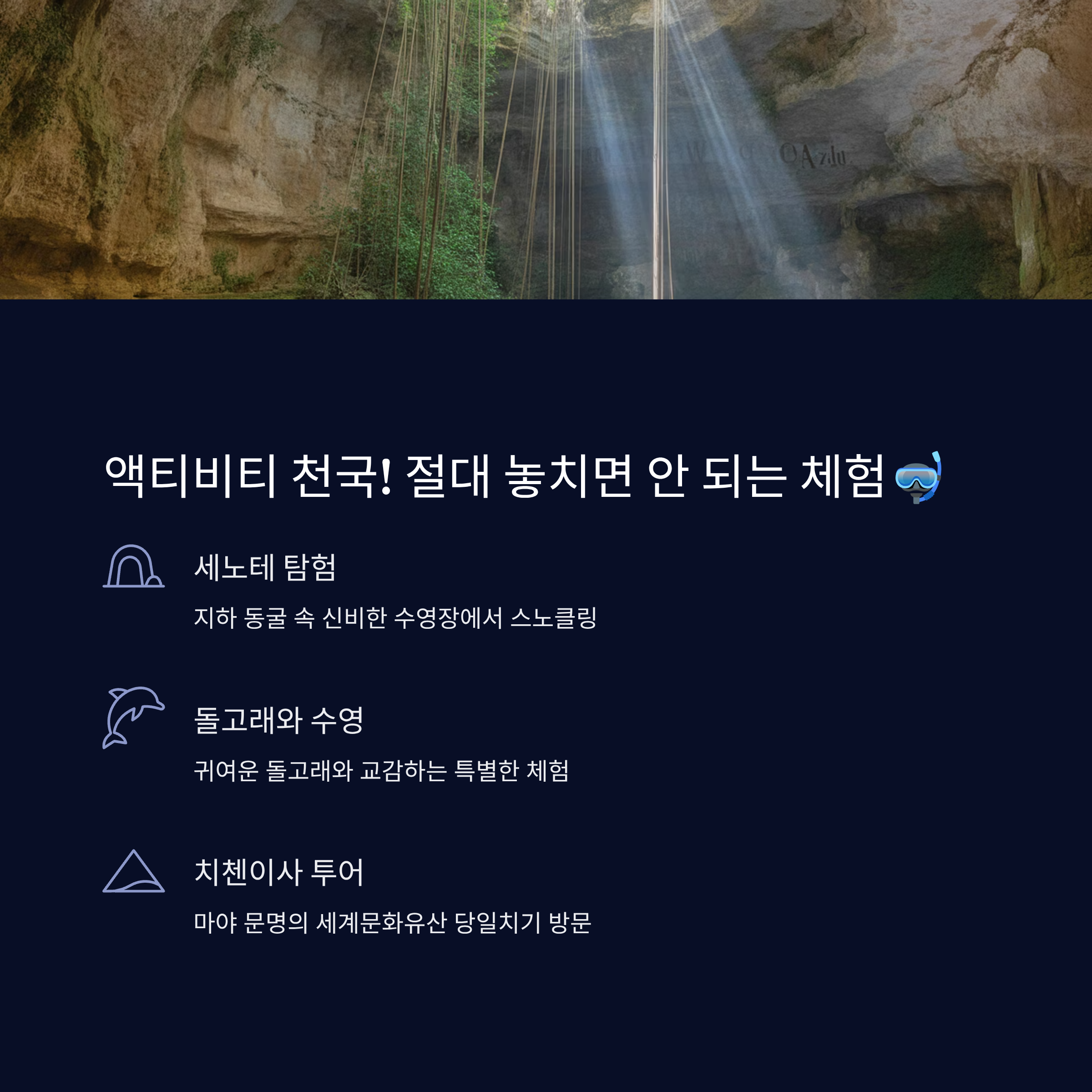 | 세노테 스노클링 | 유카탄 일대 | 4~5시간 | 지하호수 체험, 맑은 물 | 커플, 탐험가 |
