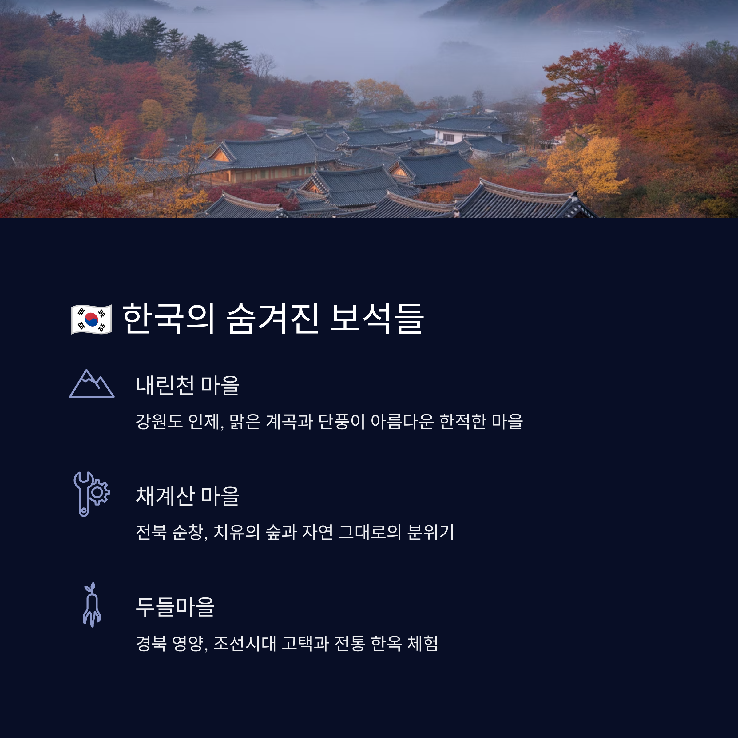도시에서 벗어나고 싶을 때, 먼 해외보다도 국내 시골마을로 눈을 돌려보면 새로운 힐링 장소를 찾을 수 있어요. 조용하고 따뜻한 풍경은 마음까지 포근하게 만들어 준답니다.