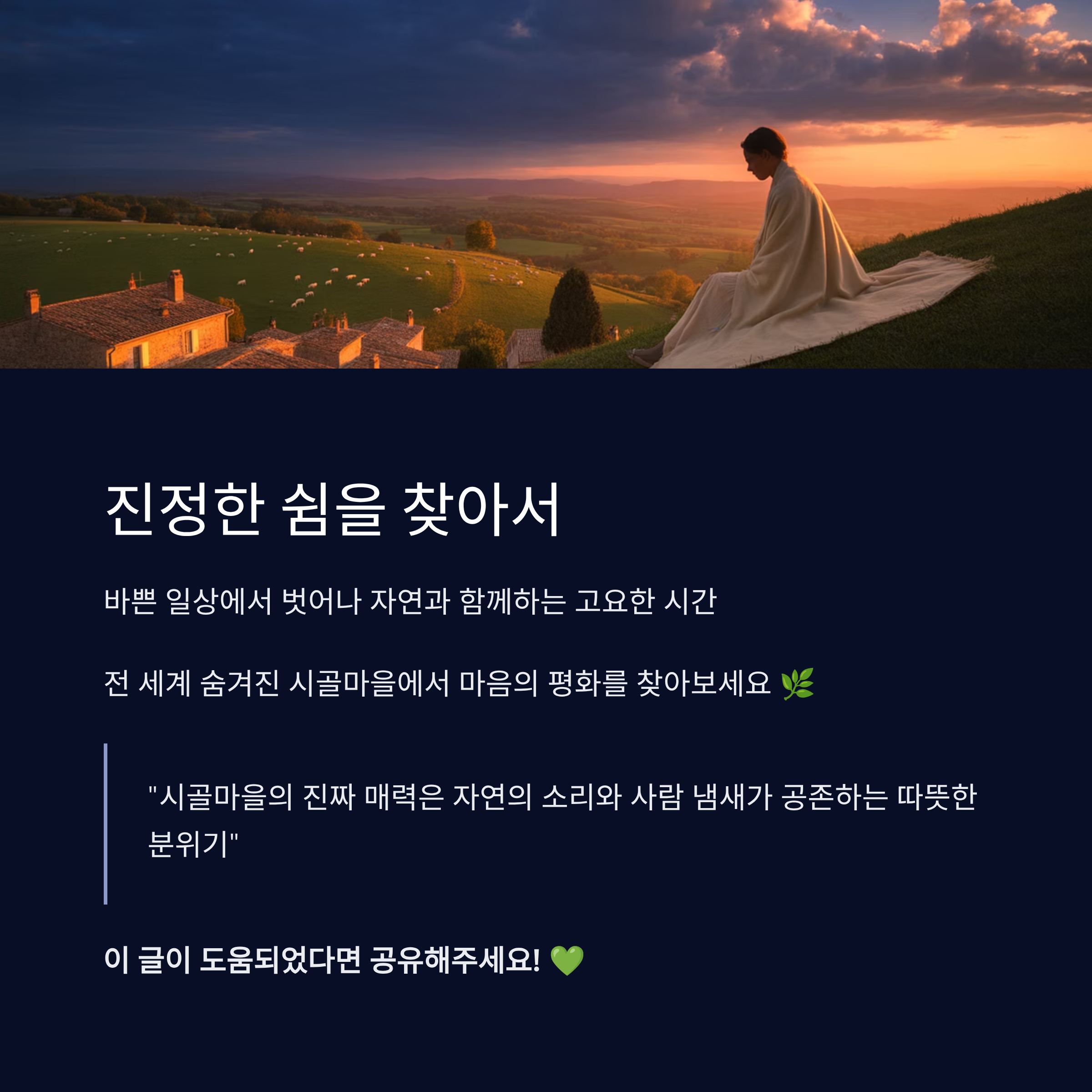 내가 생각했을 때, 시골마을의 진짜 매력은 자연의 소리와 사람 냄새가 공존하는 따뜻한 분위기라고 느껴요. 도시에서 지친 마음을 쉬게 하고, 느릿한 시간을 선물해주는 그런 공간들이죠 🍃