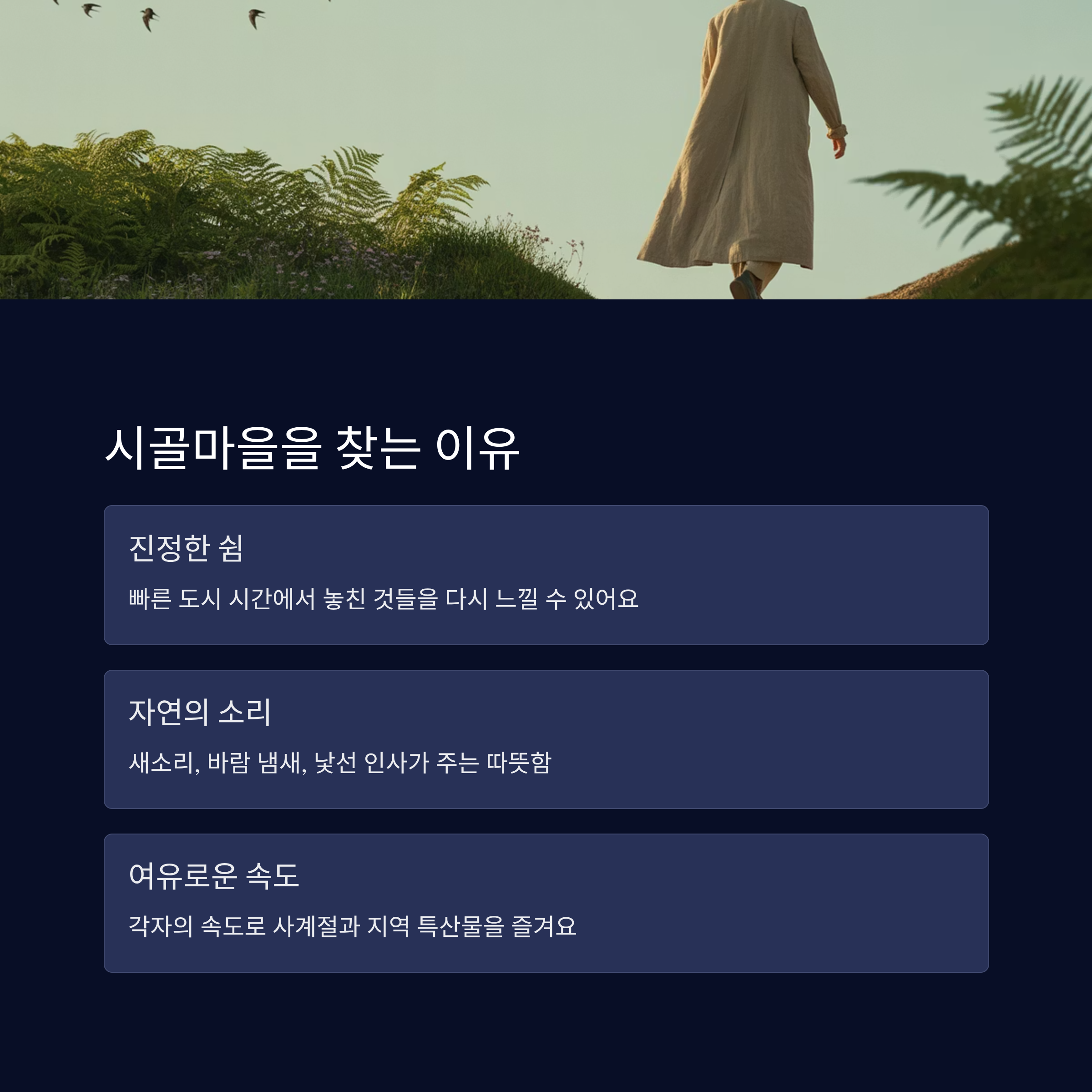 시골마을 여행이 인기 있는 이유는 단연 ‘쉼’이에요. 빠르게 흘러가는 도시의 시간 속에서는 쉽게 놓쳐버리는 것들을 시골에서는 다시 느낄 수 있죠. 새소리, 바람 냄새, 낯선 사람과 나누는 인사처럼요.
