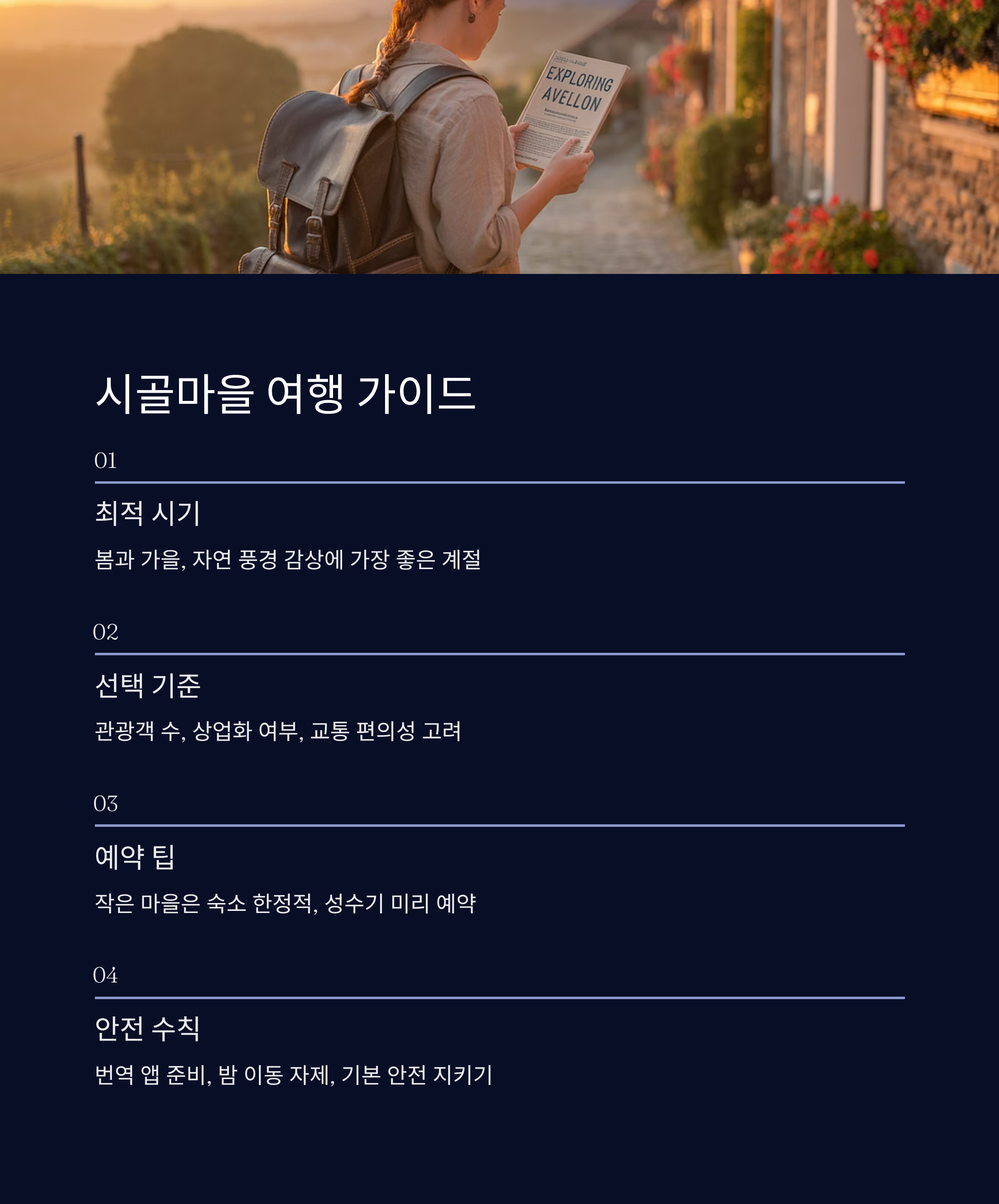 시골마을의 진짜 매력은 인공적인 관광지가 아닌, 자연스럽고 사람 냄새 나는 풍경이에요. 정형화된 여행이 아니라 각자의 속도로 여유를 느낄 수 있는 곳이죠.