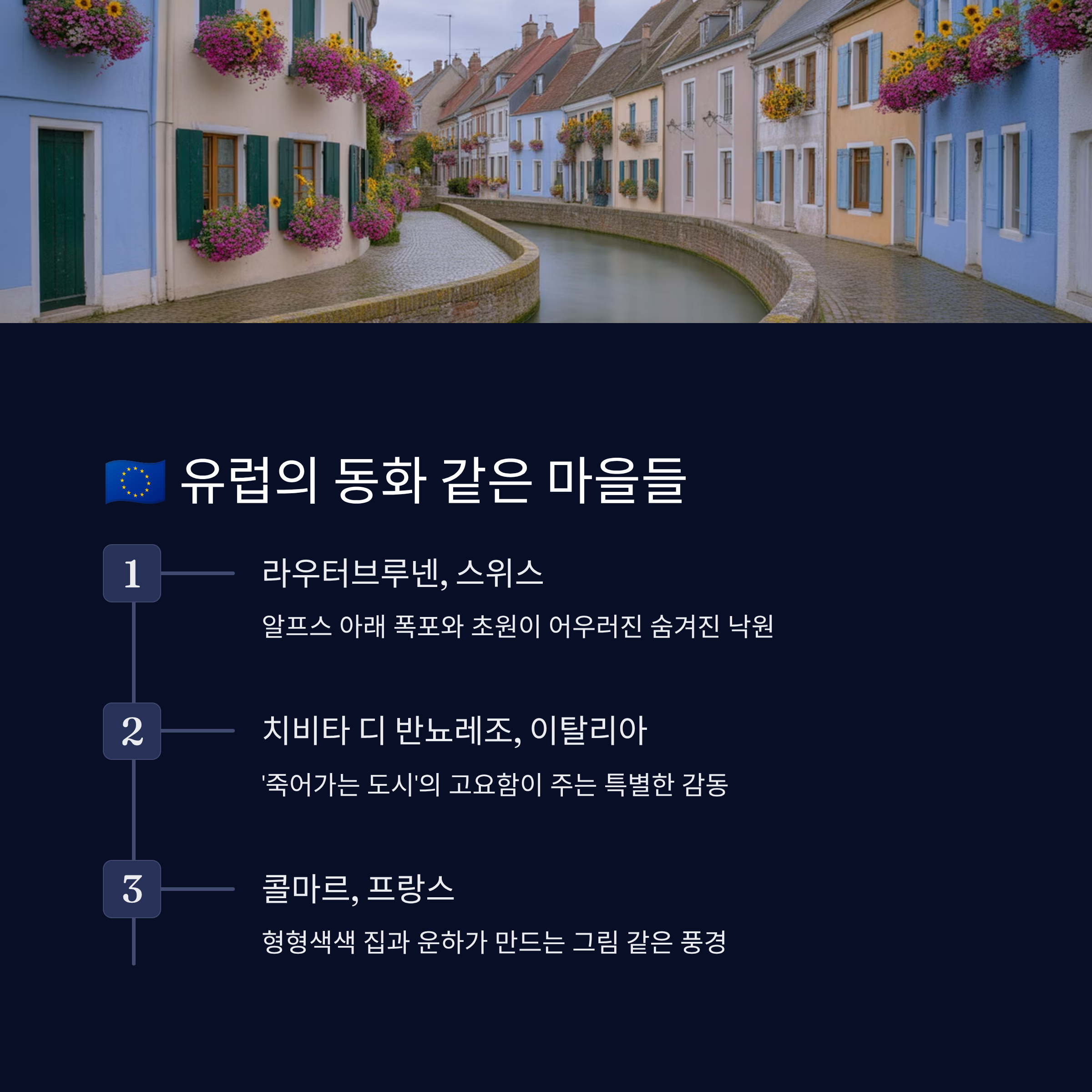 이제부터는 대륙별로 그런 ‘쉼표’를 선물해줄 진짜 시골마을들을 하나씩 소개해볼게요. 생각보다 가까운 곳에, 우리가 몰랐던 보석 같은 마을들이 많답니다 🌏