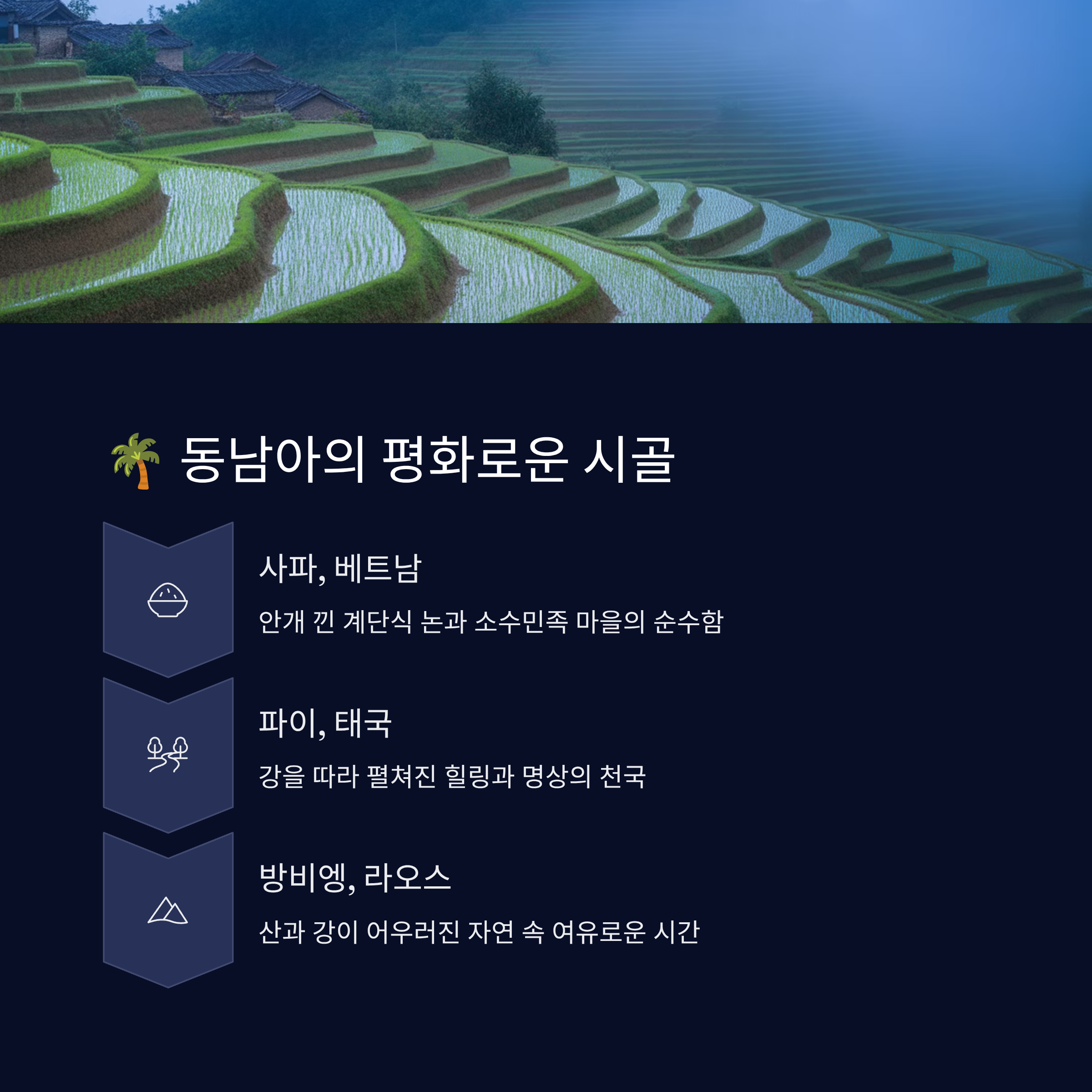 동남아에도 조용하고 힐링하기 좋은 마을들이 있어요. 베트남의 ‘사파(Sapa)’는 산악지대에 위치한 소수민족 마을로, 안개 낀 계단식 논이 절경이에요. 관광객은 많지 않고, 현지인들과 함께 살아보는 경험도 가능하죠.