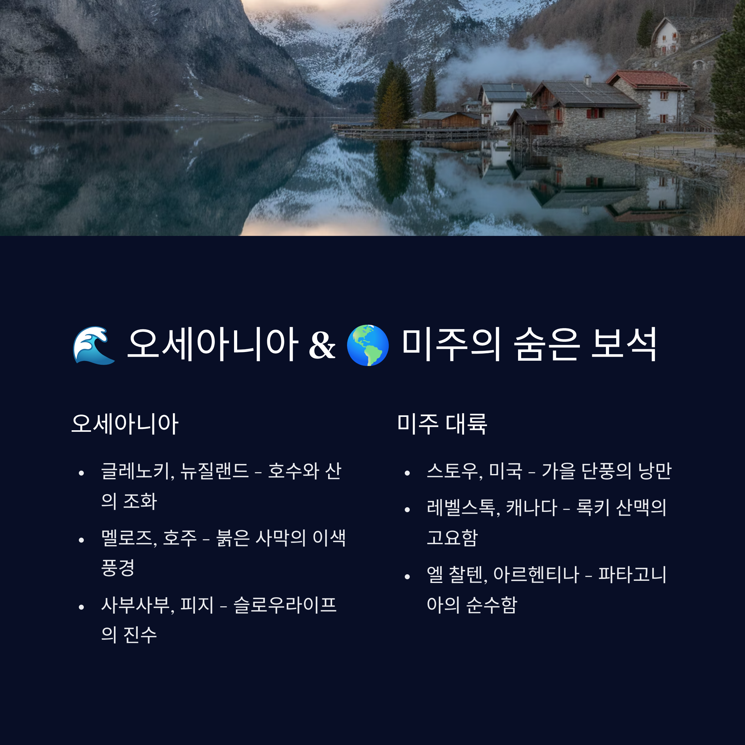 여행은 도심의 화려한 불빛보다 고요한 자연에서 더 큰 위로를 주는 경우가 많아요. 일본의 시골마을도 참 예쁘지만, 조용하고 더 숨겨진 마을을 찾고 싶을 때가 있죠. 바로 그런 분들을 위한 전 세계 '숨겨진 보석 같은 마을들'을 소개할게요.