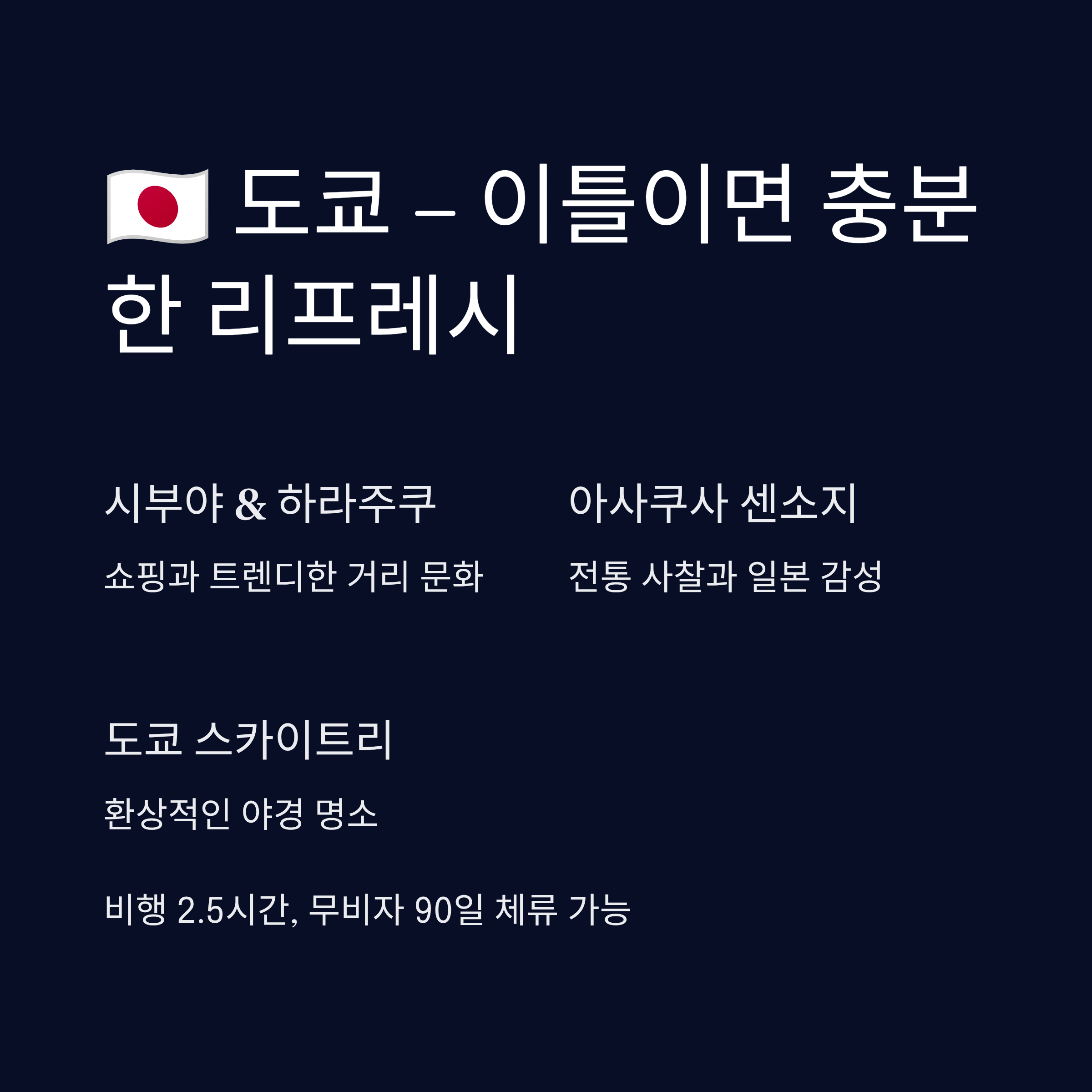 도쿄는 교통이 정말 편리해서, 2박 3일이라는 짧은 일정 안에서도 주요 명소들을 빠르게 둘러볼 수 있어요. 특히 하네다 공항은 야간 비행도 많아 금요일 퇴근 후 바로 떠나기에도 최적화된 곳이죠.